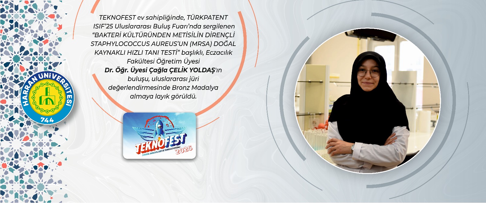 Sanayi ve Teknoloji Bakanlığı himayelerinde, İstanbul Atatürk Havalimanı’nda TEKNOFEST ev sahipliğinde, TÜRKPATENT tarafından bu yıl 10’uncu kez düzenlenen TÜRKPATENT ISIF’25 Uluslararası Buluş Fuarı’nda sergilenen “Bakteri Kültüründen Metisilin Dirençli Staphylococcus Aureus’un Doğal Kaynaklı Hızlı Tanı Testi” başlıklı buluş, uluslararası jüri değerlendirmesinde Bronz Madalya almaya layık görüldü.