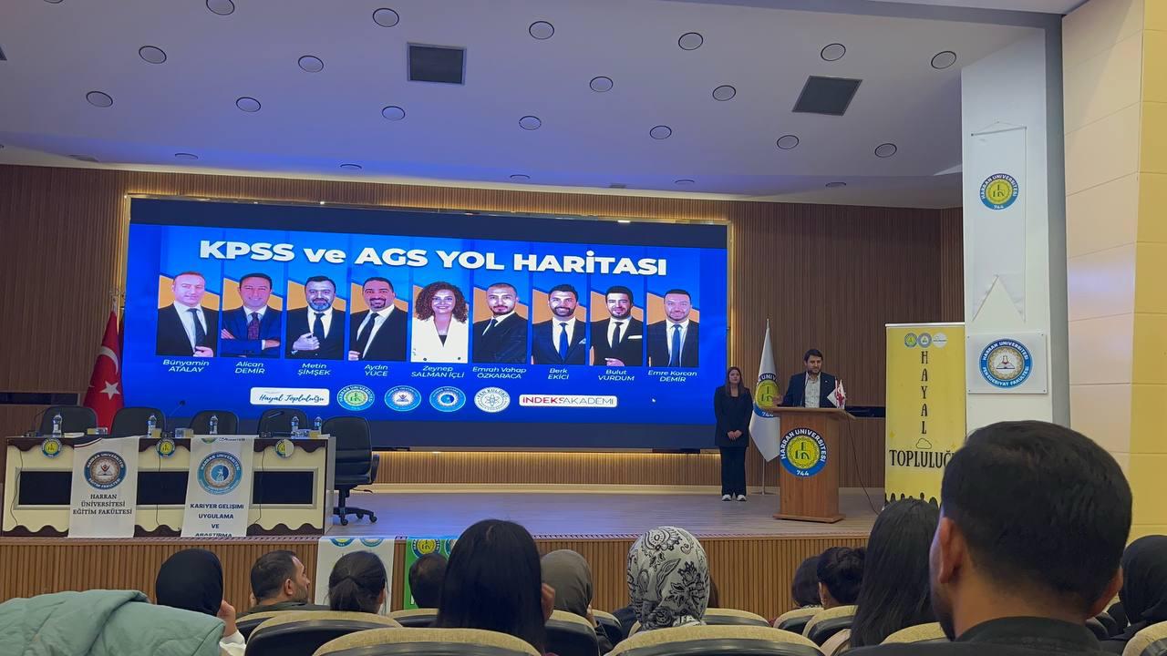 Harran Üniversitesi Kariyer Gelişimi Uygulama ve Araştırma Merkezi, Eğitim Fakültesi, Hayal Kulübü, Fen Kulübü ve İndeks Akademi Yayıncılık iş birliğinde “KPSS ve AGS (Akademi Giriş Sınavı) Yol Haritası” başlıklı seminer düzenlendi.