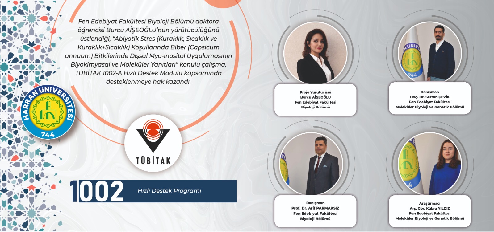 Fen Edebiyat Fakültesi Biyoloji Bölümü doktora öğrencisi Burcu Aişeoğlu’nun yürütücülüğünü üstlendiği, “Abiyotik Stres (Kuraklık, Sıcaklık ve Kuraklık + Sıcaklık) Koşullarında Biber (Capsicum annuum) Bitkilerinde Dışsal Myo-inositol Uygulamasının Biyokimyasal ve Moleküler Yanıtları” başlıklı çalışma, TÜBİTAK 1002-A Hızlı Destek Modülü kapsamında destek almaya hak kazandı.