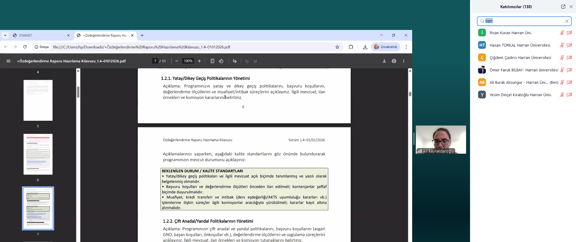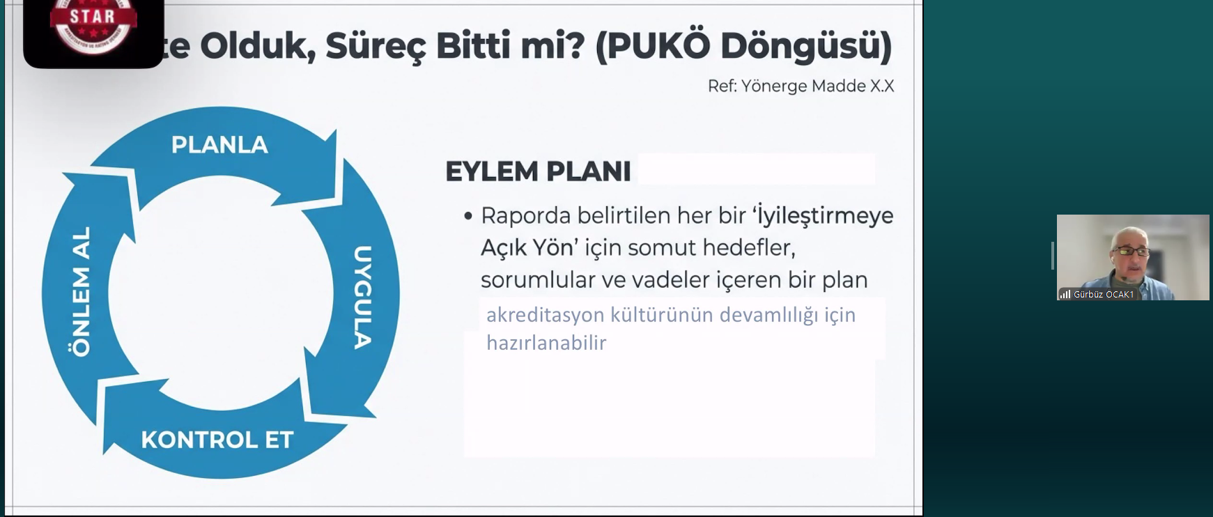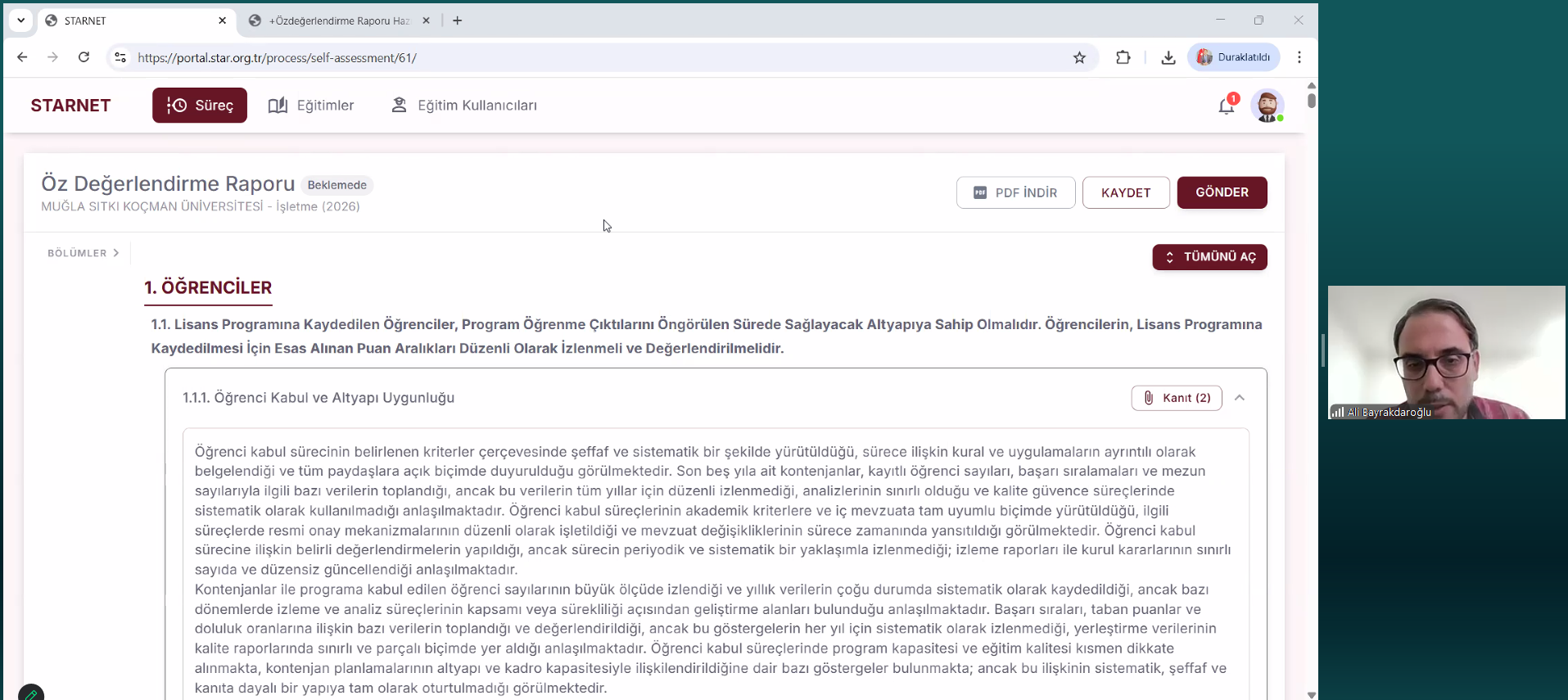 STAR Öz Değerlendirme Raporu (ÖDR) hazırlama eğitimi kapsamında 23 Mart 2026 tarihli oturumlarda, Prof. Dr. Ali BAYRAKDAROĞLU tarafından STARNET sistemi üzerinden ÖDR metinlerinin ve kanıtların sisteme eklenmesine ilişkin bilgilendirme yapılmıştır. Prof. Dr. Gürbüz OCAK tarafından yapılan sunumlarda ise Değerlendirme ve Akreditasyon Süreçleri başlığı altında STAR akreditasyon döngüsünün temel aşamaları (niyet beyanı, başvuru, ÖDR teslimi, ön değerlendirme, saha ziyareti ve karar) kritik tarihler ve sorumluluklar çerçevesinde ele alınmış; süreç bütünlüğü, hazırlık süreci ve saha ziyareti organizasyonuna ilişkin uygulama esasları değerlendirilmiştir.