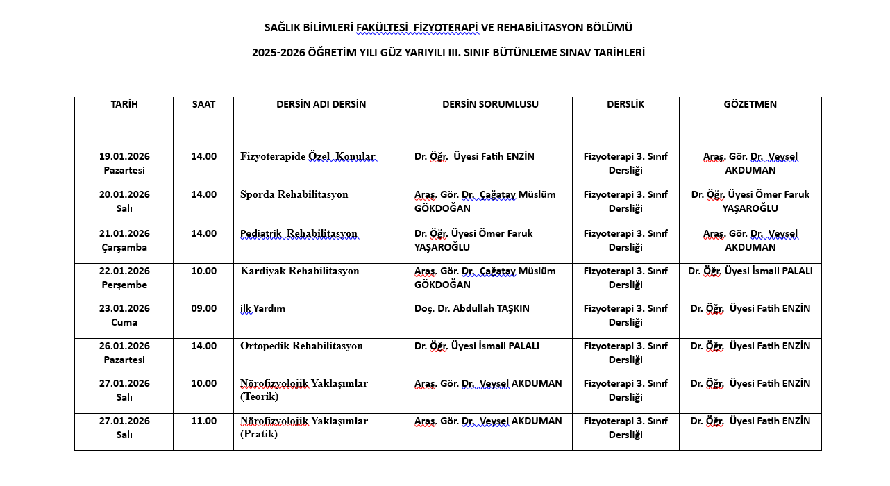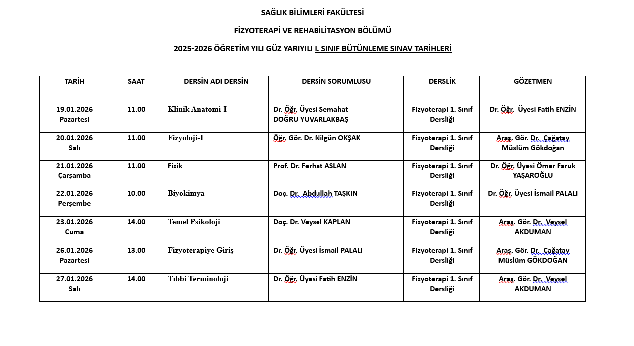 FİZYOTERAPİ VE REHABİLİTASYON 2025-2026 GÜZ BÜTÜNLEME SINAV TAKVİMİ (Güncellenmiş)
