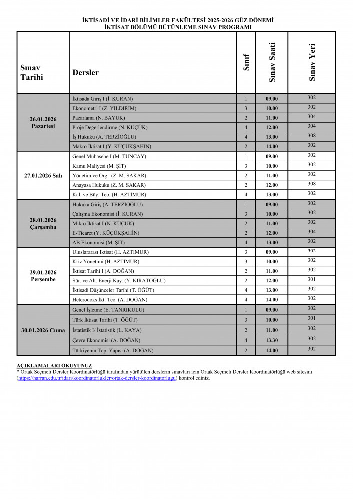 2025-2026 Güz Dönemi Bütünleme Sınav Programı