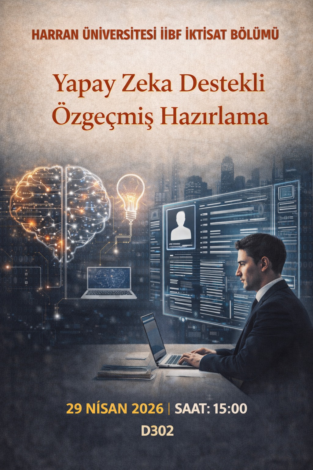 İktisat Bölümü tarafından bölümümüz öğrencileri için “Yapay Zekâ Destekli Özgeçmiş Hazırlama Eğitimi” etkinliği 29.04.2026 tarihinde saat 15.00’te D-302 numaralı salonda düzenlenecektir. Öğrencilerimizin bilgisayar ya da tablet ile eğitime katılması faydalı olacaktır. Eğitim Dr. Öğr üyesi Emine YÖNEY tarafından gerçekleştirilecektir.