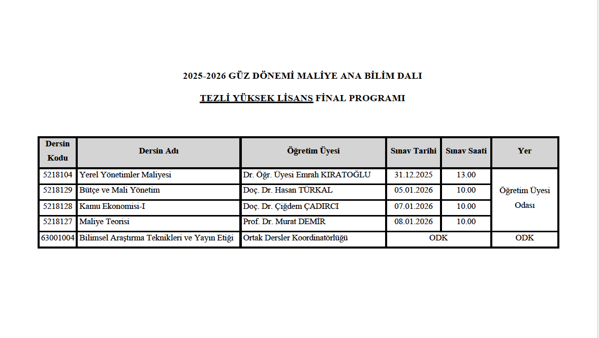2025-2026 GÜZ DÖNEMİ TEZLİ YÜKSEK LİSANS FİNAL SINAV PROGRAMI