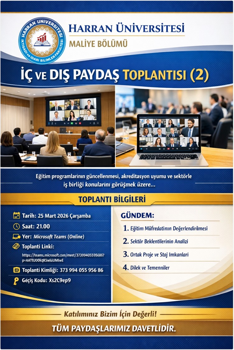 Bu kapsamda, 25 Mart 2026 Çarşamba günü 21:00'da online olarak bölümümüzün gelişim sürecine katkı sağlayacak görüş ve önerilerin değerlendirilmesi amacıyla İç ve Dış Paydaş Toplantısı (2) düzenlenecektir.