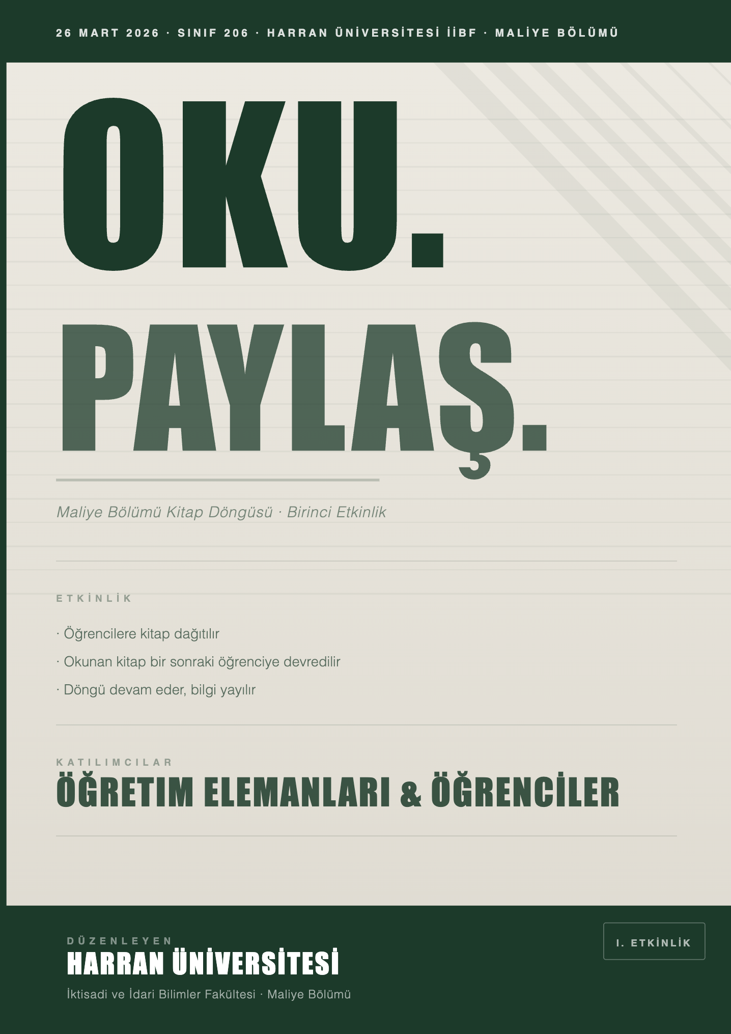 Maliye Bölümü tarafından düzenlenen “Oku, Paylaş” etkinliğinin ilki, 26 Mart 2026 tarihinde 206 numaralı sınıfta gerçekleştirildi. Etkinlik kapsamında öğrencilere kitaplar dağıtıldı. Her öğrencinin okuduğu kitabı bir sonraki öğrenciye devretmesi esasına dayanan uygulama ile bölüm içinde kitap dolaşımının artırılması, okuma kültürünün güçlendirilmesi ve paylaşım bilincinin desteklenmesi amaçlandı. Maliye Bölümü öğretim elemanları tarafından 26 Mart 2026 tarihinde üniversite okuma salonuna kitap bağışında bulunuldu. Gerçekleştirilen etkinlikte farklı alan ve türlerde seçilen kitaplar okuma salonuna kazandırılarak öğrencilerimizin kullanımına sunuldu. Bölümümüz, öğrencilerimizin okuma alışkanlığını desteklemeye yönelik çalışmaları sürdürmeye devam etmektedir.
