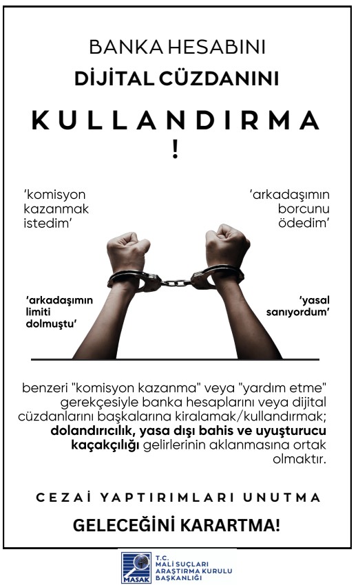 Banka hesabınızın ya da kripto cüzdanınızın; dolandırıcılık, yasa dışı bahis, sanal kumar, uyuşturucu ticareti gibi suç gelirlerinin transferinde kullanılması durumunda işlenen suça iştirak etmiş olursunuz.