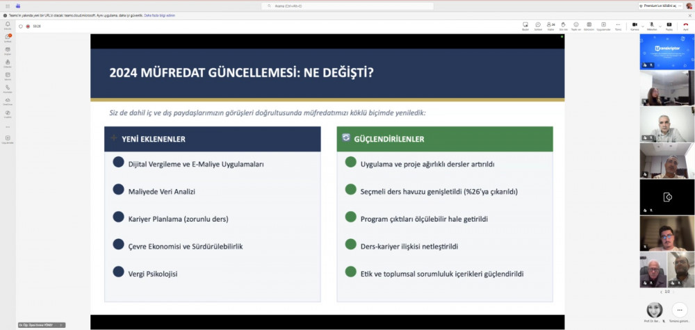 Toplantıda, geçmiş paydaş geri bildirimleri doğrultusunda 2024 müfredatında yapılan güncellemeler de paylaşıldı. Bu kapsamda dijital vergileme, e-maliye uygulamaları, bilgisayarlı muhasebe, veri analizi, kariyer planlama, meslek etiği, çevre ekonomisi ve sürdürülebilirlik ile vergi psikolojisi gibi alanların müfredatta daha görünür hale getirildiği ifade edildi. Ayrıca yapay zekâ, makine öğrenimi, yeşil ekonomi, iklim kanunu, karbon içerikli vergilendirme ve sürdürülebilirlik denetimi gibi yeni nesil başlıkların da ilerleyen süreçte değerlendirilmesi gerektiği vurgulandı.