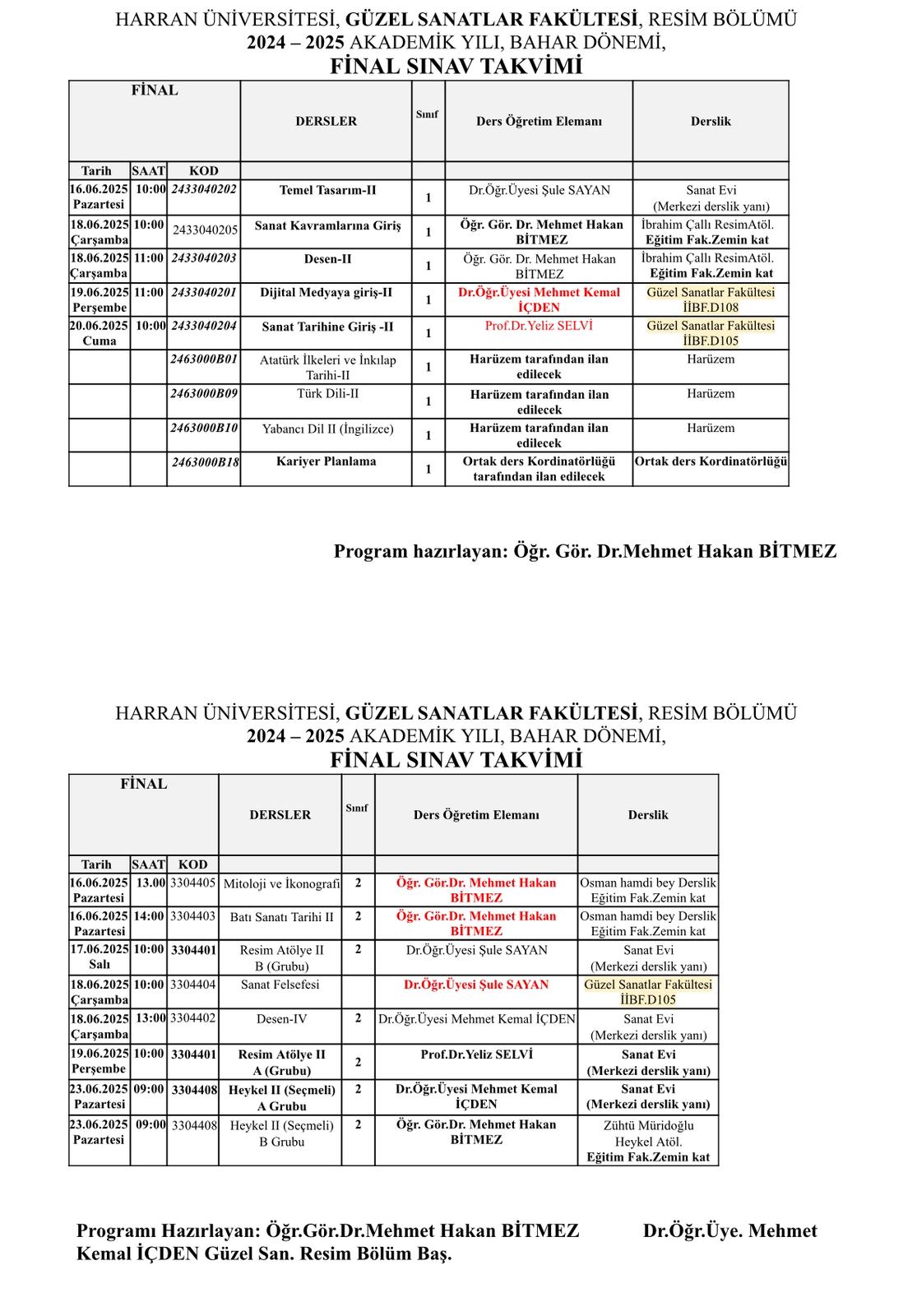 2024-2025 BAHAR DÖNEMİ FİNAL TARİHLERİ
