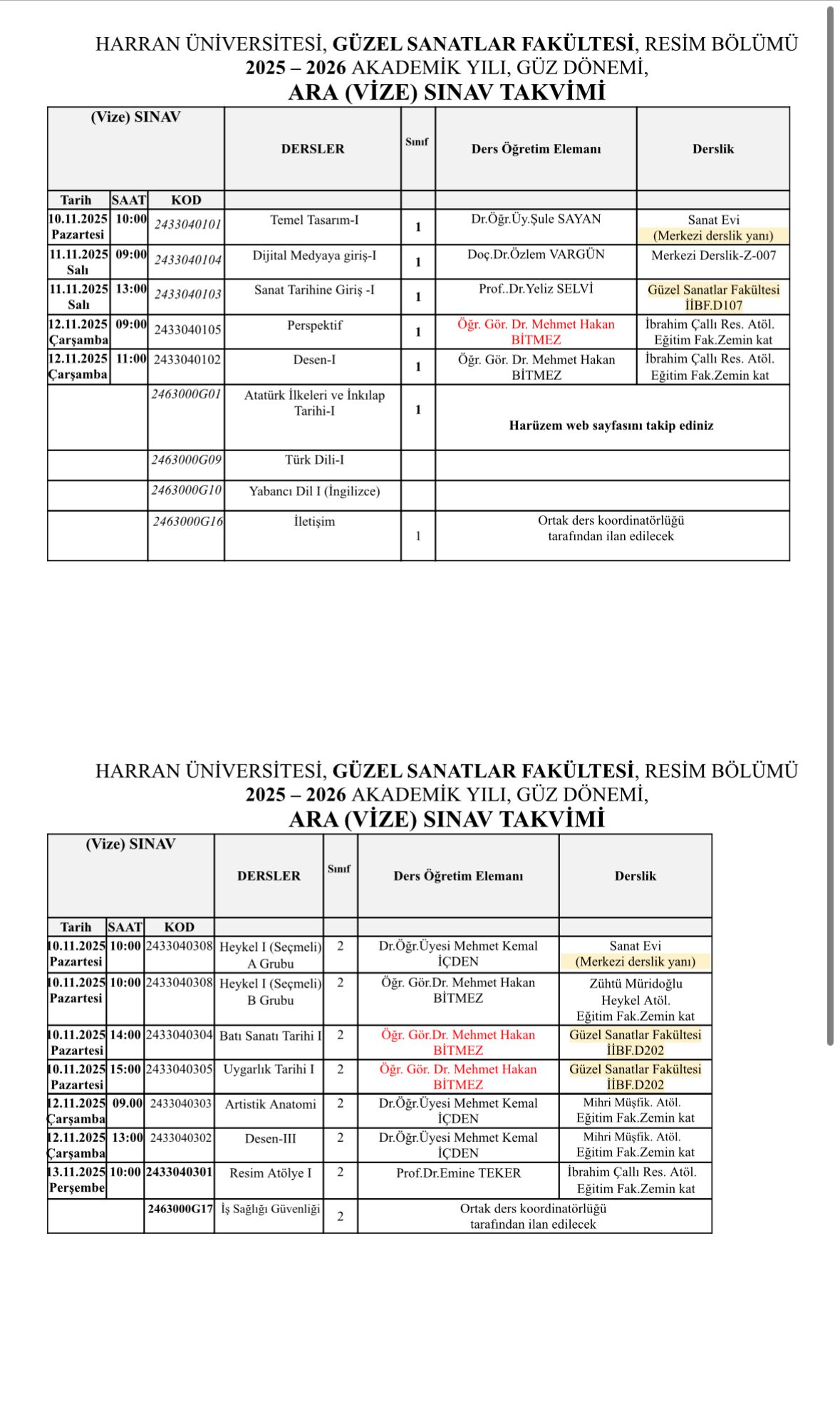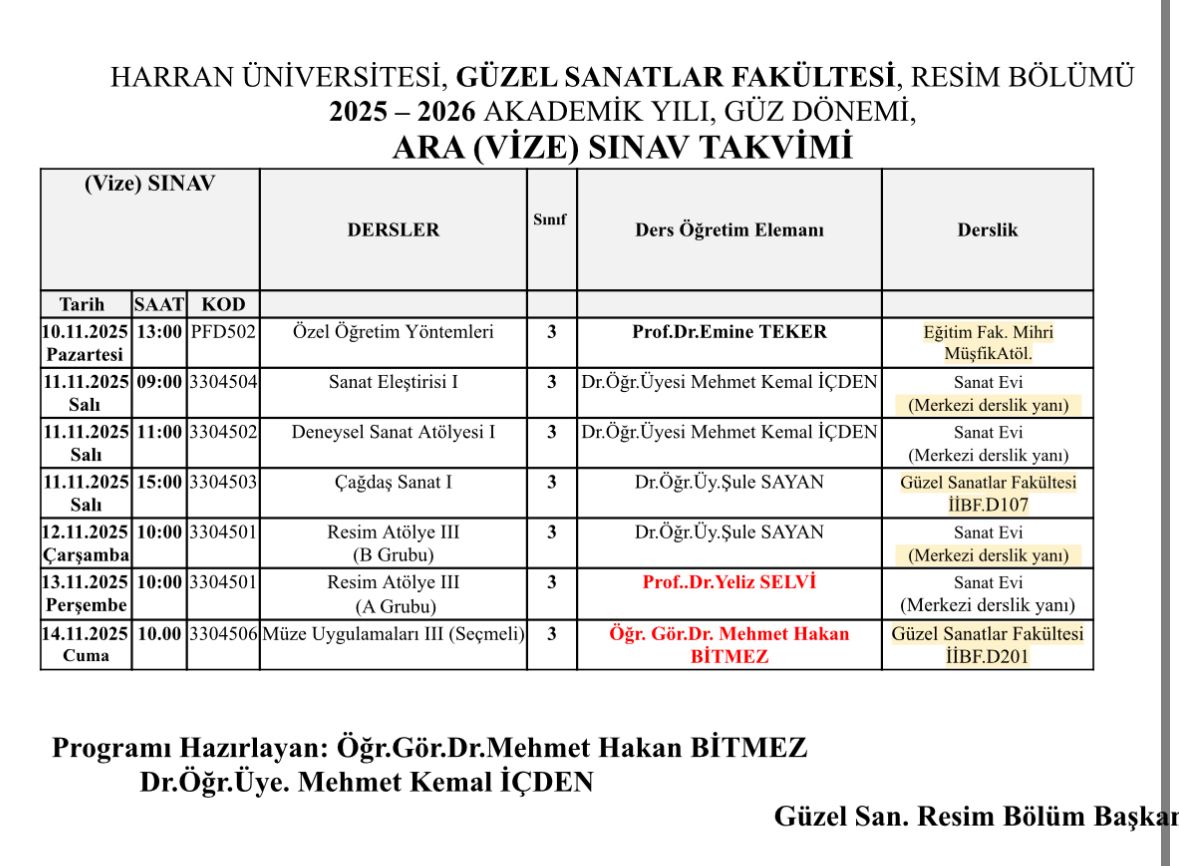 2025-2026 Akademik Yılı, Güz Dönemi Vize Sınav Takvimi