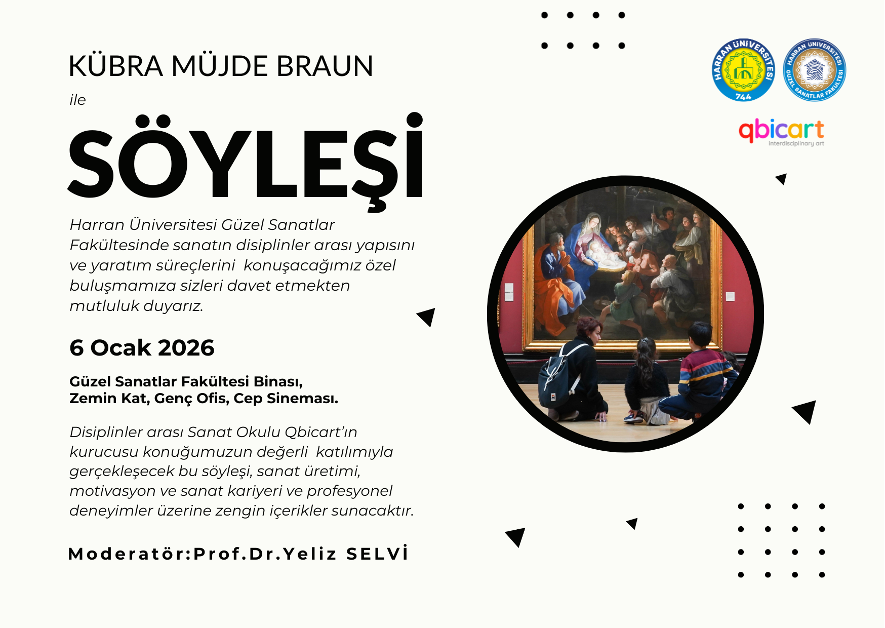 Etkinlik kapsamında, kurucusu olduğu Qbiart’ın disiplinlerarası sanat alanı çerçevesinde; sanatçının üretim süreci, güncel sanat yaklaşımları ve uluslararası sanat ortamındaki deneyimleri ele alınacaktır. Söyleşi ve paylaşımlar, sanatın coğrafyalar arası dolaşımını ve Harran’dan dünyaya uzanan yaratıcı perspektifleri görünür kılacaktır.