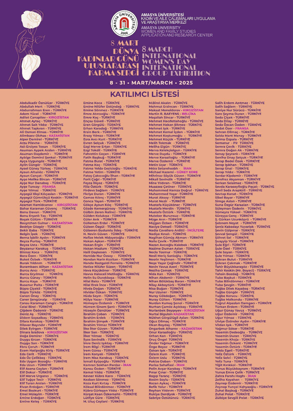 Resim Bölümü Öğretim elemanları Prof.Dr. Yeliz Selvi, Dr. Öğr.Üyesi Kemal İçden, Dr. Öğr.Üyesi Şule Sayan ve Öğr. Gör Dr. Hakan Bitmez Amasya Üniversitesinin Düzenlediği 8 Mart Dünya Kadınlar Günü özelindeki uluslararası karma sergiye eserleriyle katıldılar. Aynı sergide bölüm 2. sınıf öğrencilerimizden Hivda Doğan ve Orhan Kan'ın çalışmalarıda sergilemeye layık görülmüştür. Üniversitemizi lisans düzeyinde temsil eden öğrencilerimizi tebrik eder başarılarının devamını dileriz.