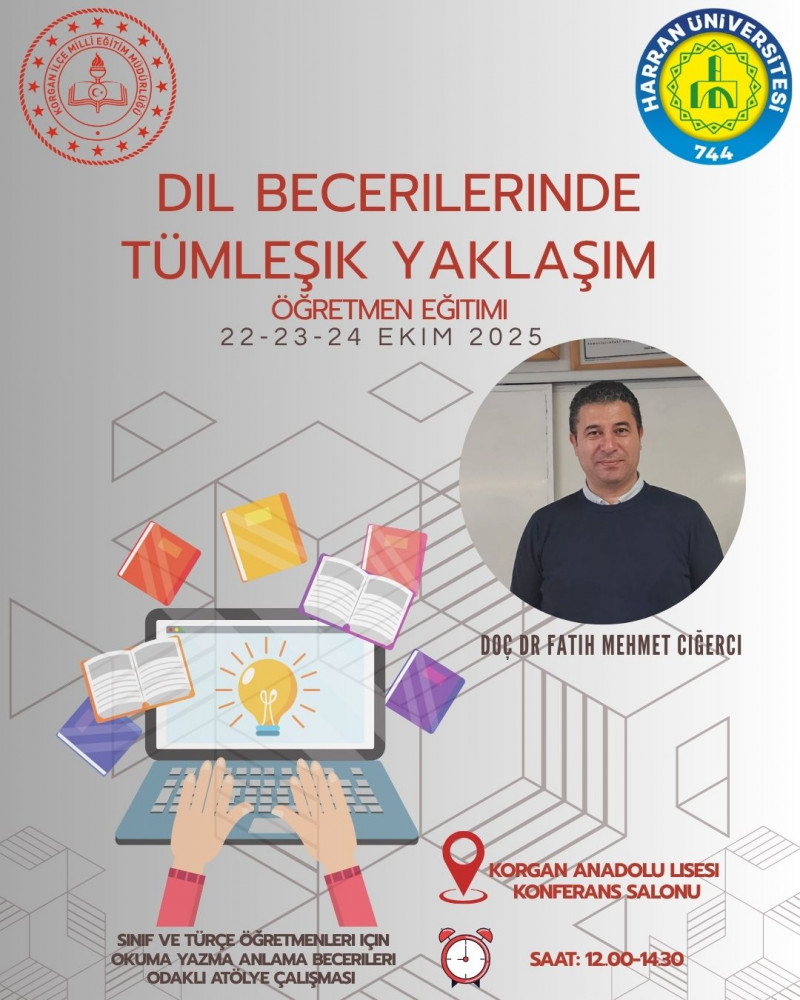 Temel Eğitim Bölümü Sınıf Eğitimi Ana Bilim Dalı Başkanı Doç. Dr. Fatih Mehmet CİĞERCİ 22-24 Ekim 2025 tarihlerinde Korgan İlçe Milli Eğitim Müdürlüğüne koordinesinde Korgan Anadolu Lisesi konferans salonunda ilkokul 3. ve 4.sınıf zümre başkanları ile Türkçe öğretmenlerine "Dil Becerilerinde Tümleşik Yaklaşım" konulu eğitim verecektir.