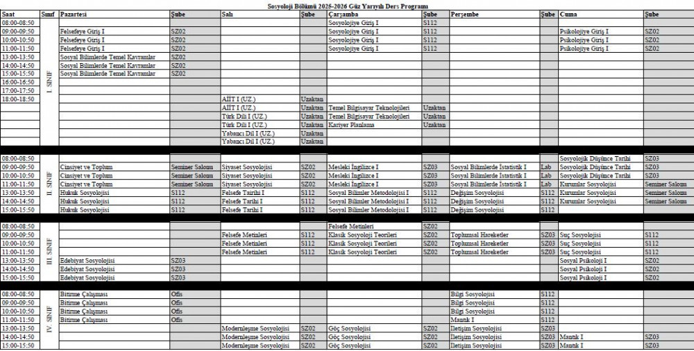 Sosyoloji Bölümü 2025-2026 Güz Yarıyılı Ders Programı