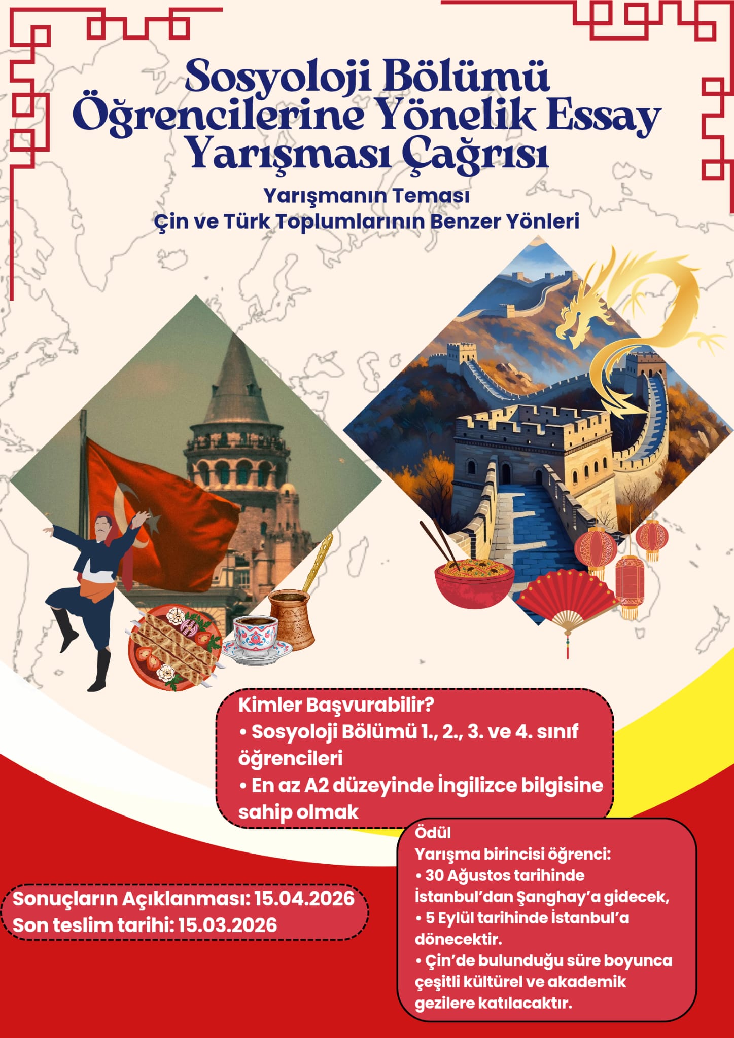 Sosyoloji Bölümü öğrencilerine yönelik olarak, Çin ve Türk toplumlarının benzer yönlerini sosyolojik bir perspektifle ele alan bir essay yarışması düzenlenecektir.