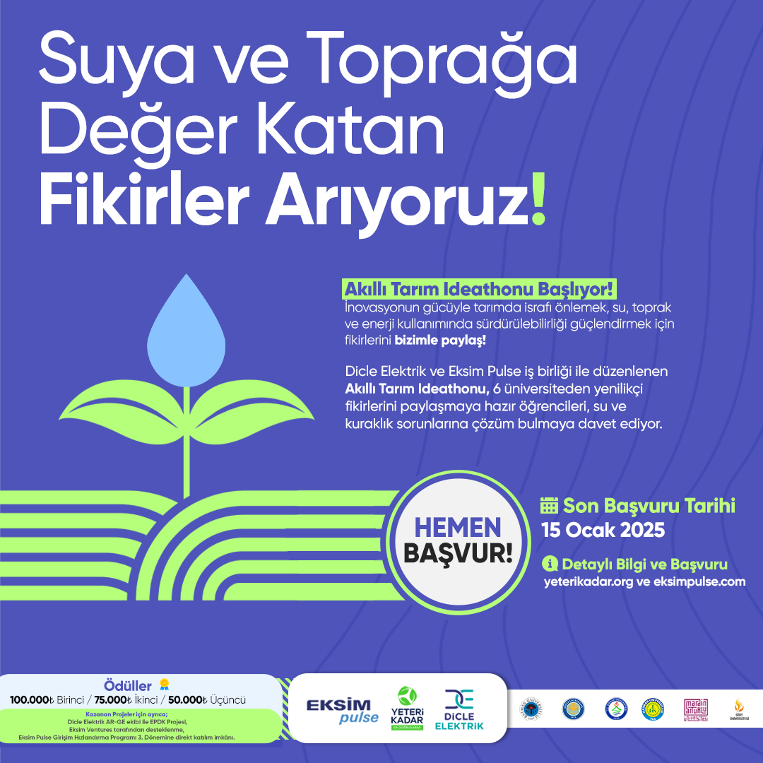 Su kaynaklarının azalması ve iklim değişikliğinin etkileri, suyun verimli ve sürdürülebilir kullanımını her zamankinden daha önemli hale getiriyor. Bu doğrultuda, üniversite öğrencilerine yönelik düzenlediğimiz "Yeteri Kadar En Doğru Karar Ideathon" ile Batman, Diyarbakır, Mardin, Siirt, Şanlıurfa ve Şırnak'taki üniversitelerde eğitim gören gençleri, suyun geleceğini şekillendirecek yenilikçi fikirler üretmeye davet ediyoruz!