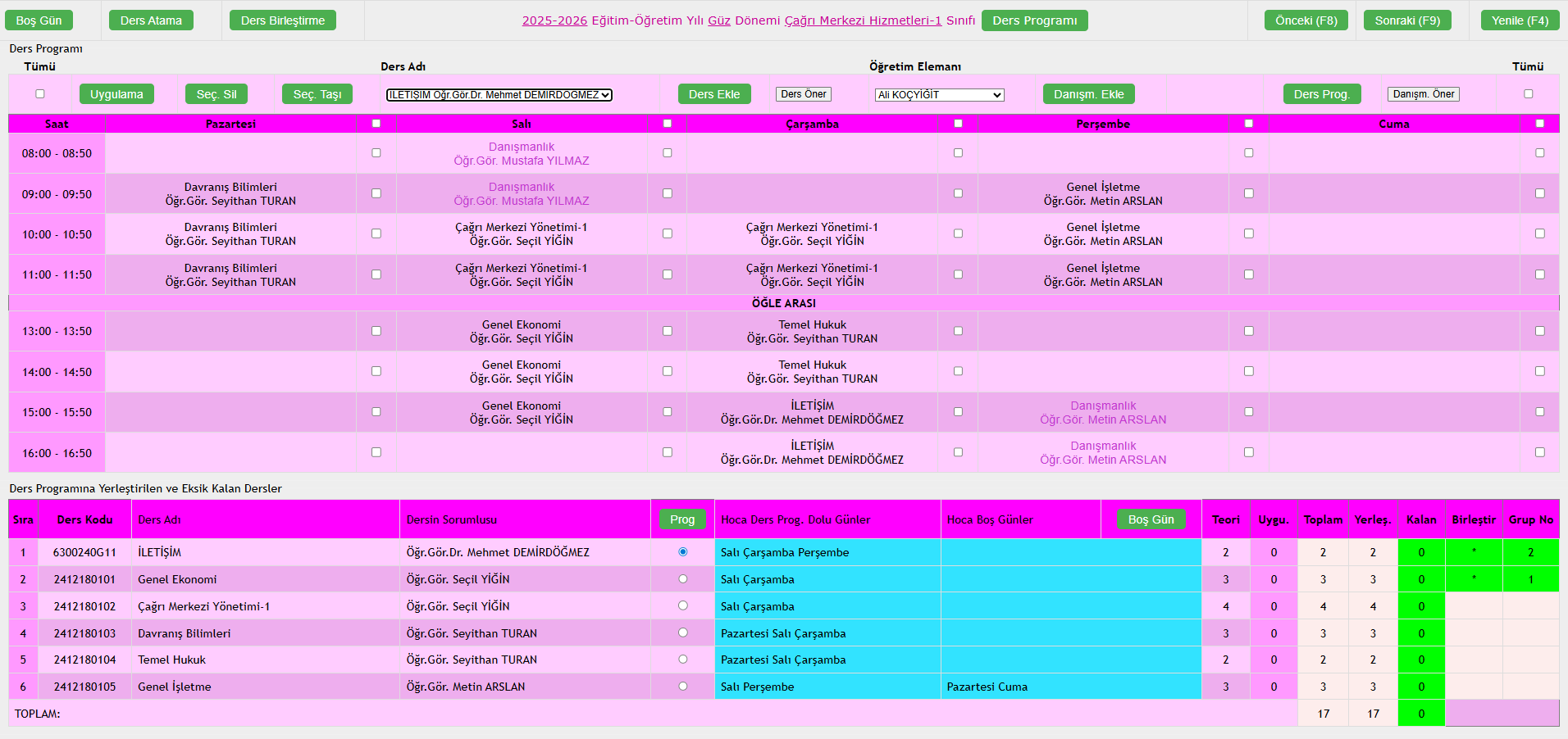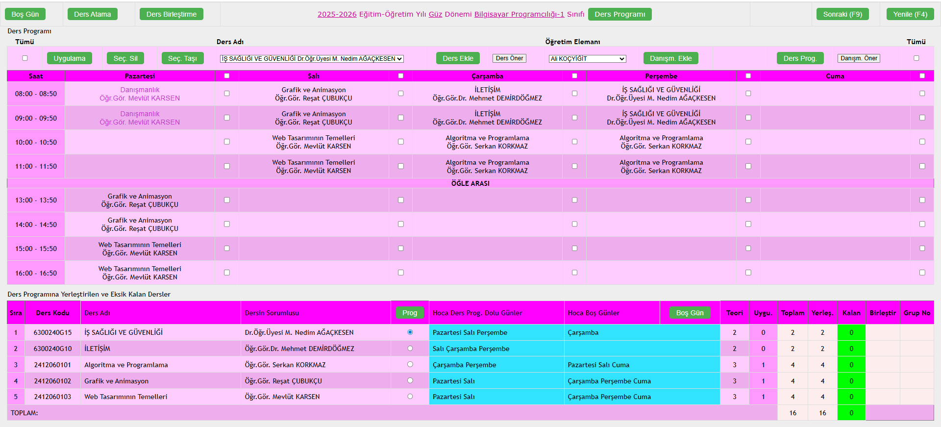 Ayrıca Yüksekokulumuz Bilgisayar Teknolojileri bölüm başkanı Öğr. Gör. Serkan KORKMAZ tarafından hazırlanan yazılım sistemi üzerinden yeni dönem ders programlarımızda bölümlerden gelen ders programlarındaki çakışmalar giderilmiştir. Okulumuzda yüz yüze açılan İletişim ve Girişimcilik gibi ortak dersler de ders programlarımıza eklenmiştir.