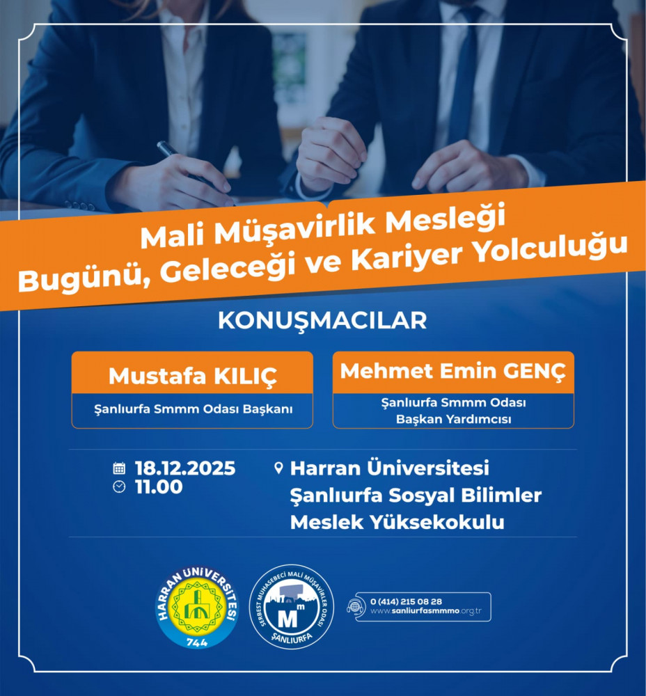 Muhasebe ve vergi uygulamaları bölğmü 18 Aralık 2025 Perşembe günü SMMM Odası Başkanı Mustafa Kılıç ve Oda Başkan Yardımcısı Emin Genç in katılımlarıyla mesleki tanıtkm semineri düzenleyecektir. Veterinerlik Fakğltesi Konferans Salonunda gerçekleştirlecek seminerimize Tüm öğrencilerimiz ve hocalarımız davetlidir.