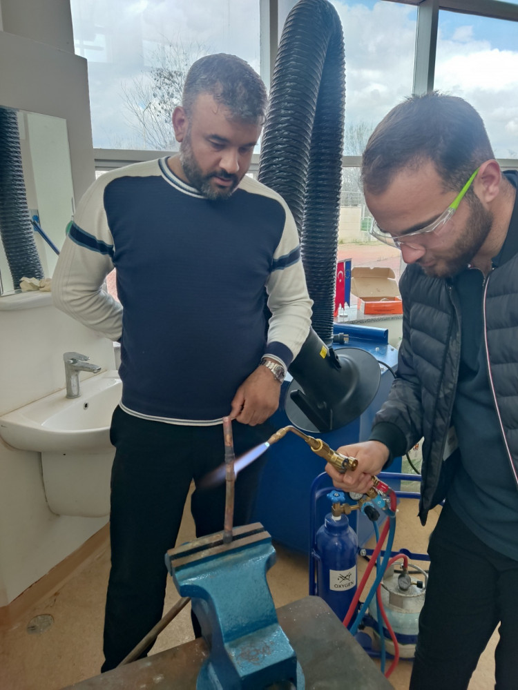 İklimlendirme ve Soğutma Teknolojisi Programı Öğrencilerimizden GAPYENEV Ziyaretiİklimlendirme ve Soğutma Teknolojisi Programı öğrencilerimiz, öğretim elemanlarımız eşliğinde Malzeme Bilgisi ve Tesisat İşlemleri dersleri kapsamında uygulamalı eğitim faaliyetleri çerçevesinde Makina Mühendisliği Laboratuvarları ile GAPYENEV’i ziyaret etmiştir. Gerçekleştirilen teknik gezide öğrencilerimiz, İmalat ve Konstrüksiyon Atölyesi’nde elektrik ark kaynağı, bakır boruların kesilmesi, muf açma ve sert lehimleme işlemlerini uygulamalı olarak gerçekleştirme imkânı bulmuştur. GAPYENEV bünyesindeki İklimlendirme-Soğutma Laboratuvarı’nda ise modern iklimlendirme ve klima sistemleri yerinde incelenmiş, sistemlerin çalışma prensipleri hakkında detaylı bilgiler edinilmiştir. Bu teknik gezi sayesinde öğrencilerimiz, teorik bilgilerini sahada uygulama fırsatı yakalayarak mesleki becerilerini geliştirmiş ve sektör uygulamalarını yakından tanıma imkânı elde etmiştir.