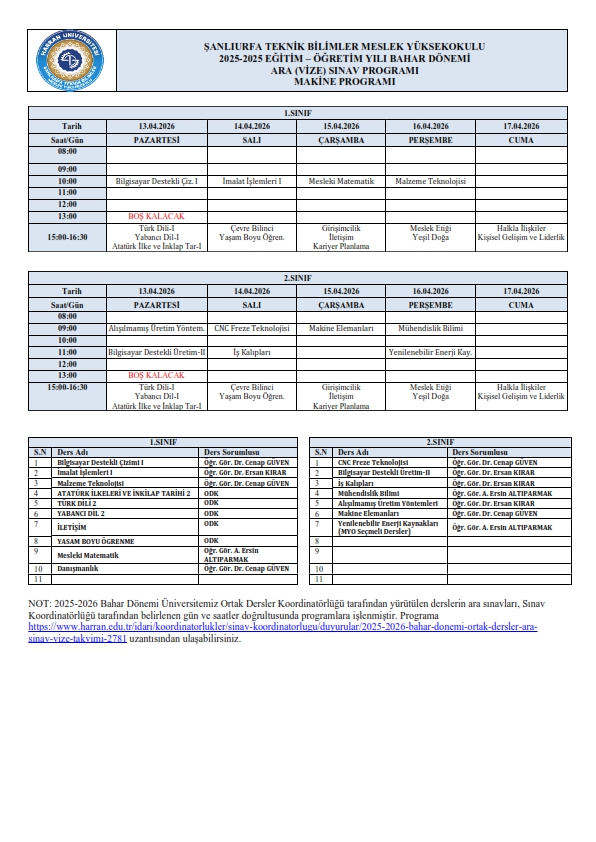 2025-2026 BAHAR DÖNEMİ ARA SINAV PROGRAMI