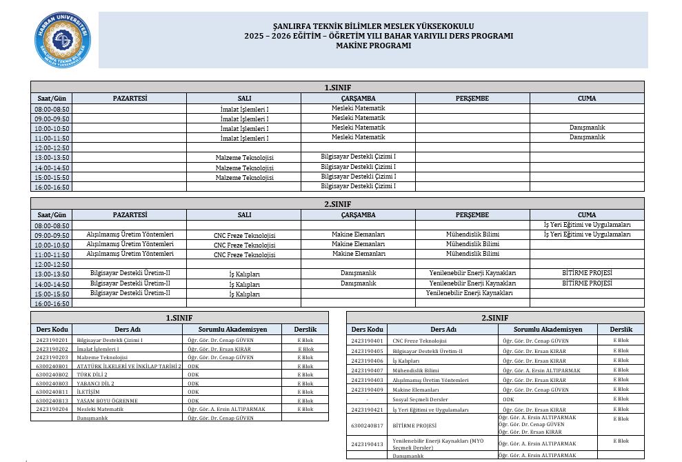 Bahar Dönemi Makine Programı Ders Programıı