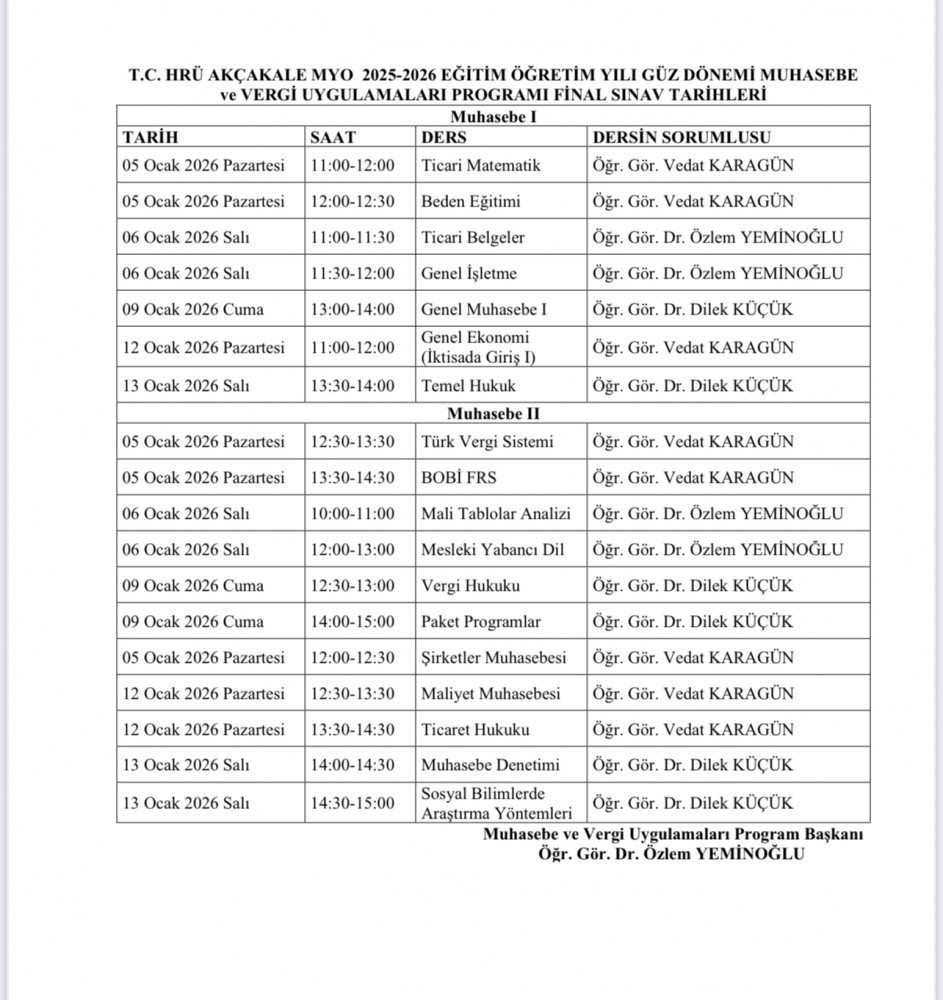 2025-2026 Güz Yarıyılı Final Sınav Programı