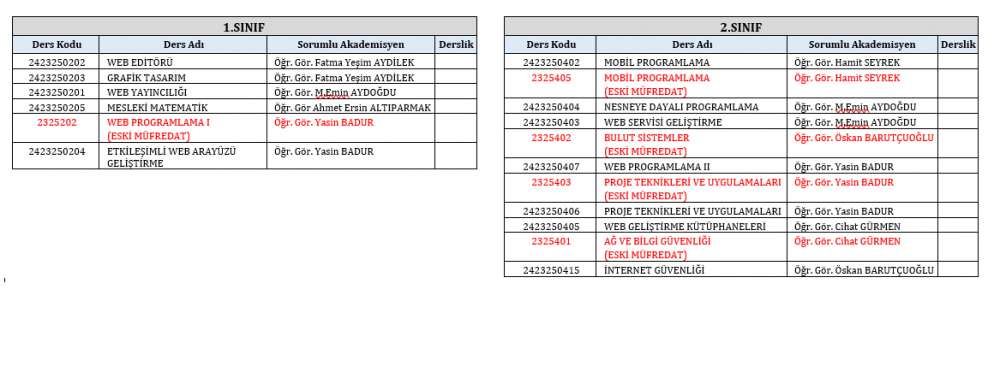 2025-2026 Bahar Dönemi Ders Programı