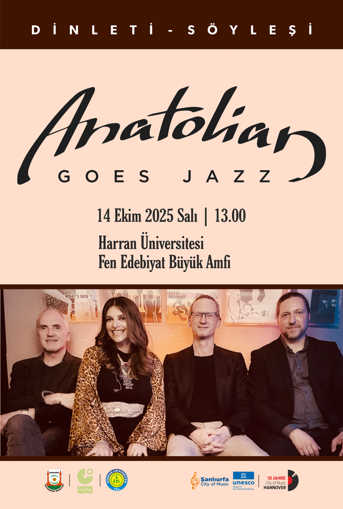 Şanlıurfa Büyükşehir Belediyesi, Konservatuvarımız ve Eğitim Fakültesi Güzel Sanatlar Eğitimi Bölümü Müzik Eğitimi Ana Bilim Dalı işbirliğiyle, Almanya Hannover Belediyesi ve Goethe Enstitüsü desteğiyle "Anatolian Goes Jazz" Grubu tarafından düzenlenecek konser ve müzik atölye çalışmaları (workshop), 14 Ekim 2025 tarihinde, saat 13:00'de Fen Edebiyat Fakültesi Büyük Amfide yapılacaktır.