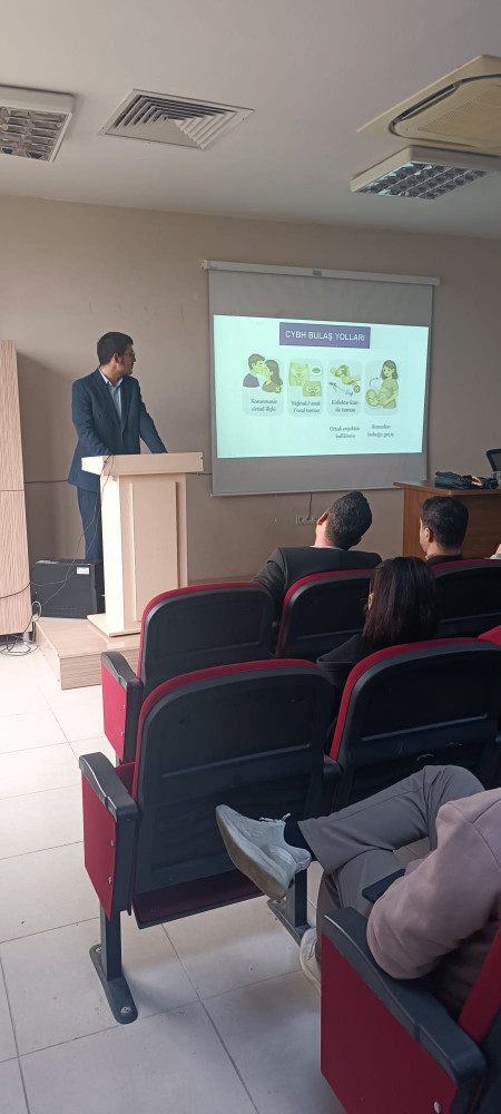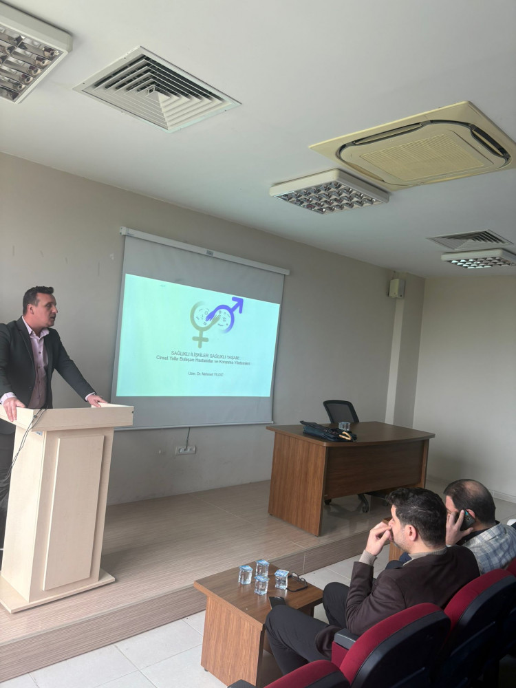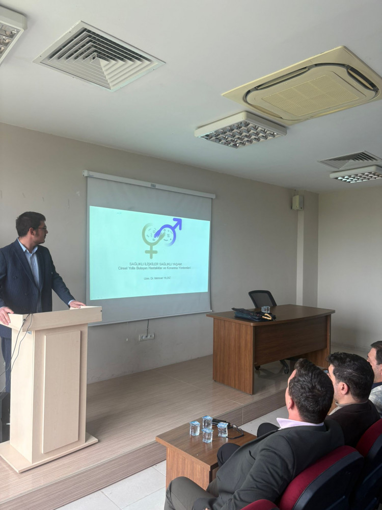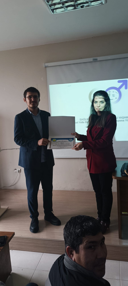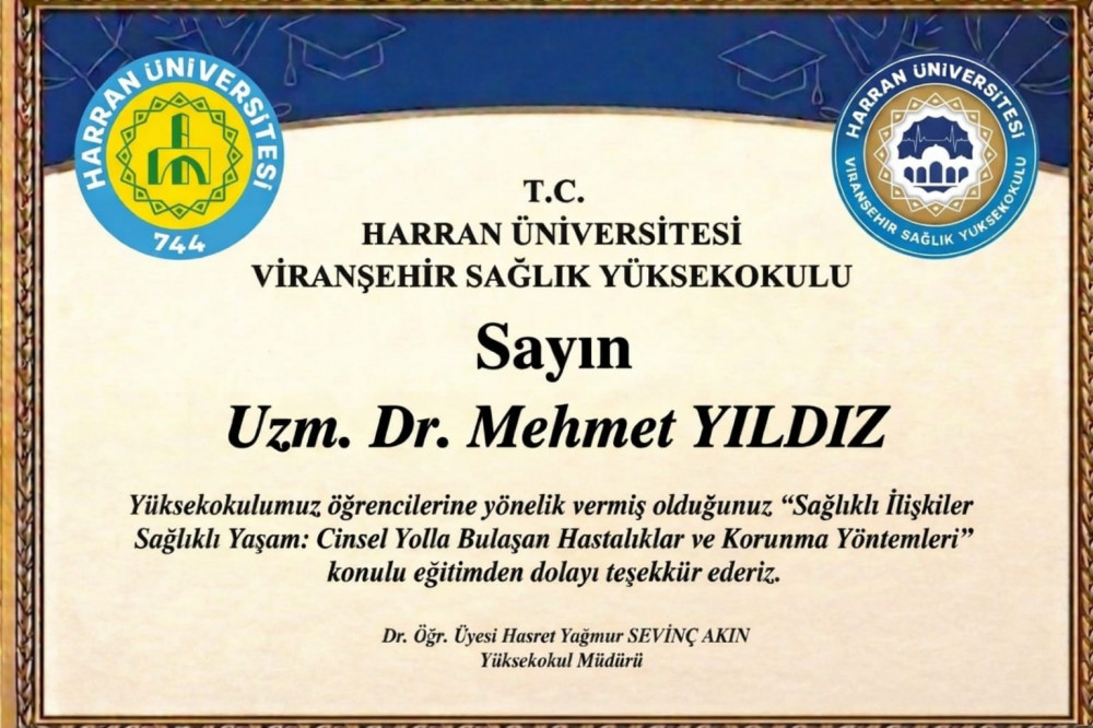 09.04.2026 tarihinde Viranşehir Sağlık Yüksekokulu Hemşirelik Bölümü tarafından, hemşirelik bölümü öğrencilerine ve meslek yüksekokulunda öğrenim gören öğrencilere yönelik olarak “Sağlıklı İlişkiler, Sağlıklı Yaşam: Cinsel Yolla Bulaşan Hastalıklar ve Korunma Yöntemleri” başlıklı bilgilendirme eğitimi düzenlenmiştir. Söz konusu eğitim Uzm. Dr. Mehmet YILDIZ tarafından verilmiş olup katılımcılara güncel, bilimsel ve koruyucu sağlık yaklaşımını temel alan kapsamlı bilgiler sunulmuştur. Viranşehir Sağlık Yüksekokulu müdürü Dr. Öğr. Üyesi Hasret Yağmur SEVİNÇ AKIN tarafından eğitimde emeği geçen Uzm. Dr. Mehmet YILDIZ'a teşekkür belgesi sunulmuştur. Toplum sağlığının geliştirilmesi ve genç bireylerde farkındalık oluşturulması açısından büyük önem taşıyan bu değerli etkinliğin düzenlenmesinde emeği geçen Viranşehir Sağlık Yüksekokulu Hemşirelik Bölümü’ne, kıymetli katkılarıyla eğitime değer katan Uzm. Dr. Mehmet YILDIZ’a, katılım sağlayan değerli öğretim elemanlarımıza ve öğrencilerimize teşekkürlerimizi sunarız.