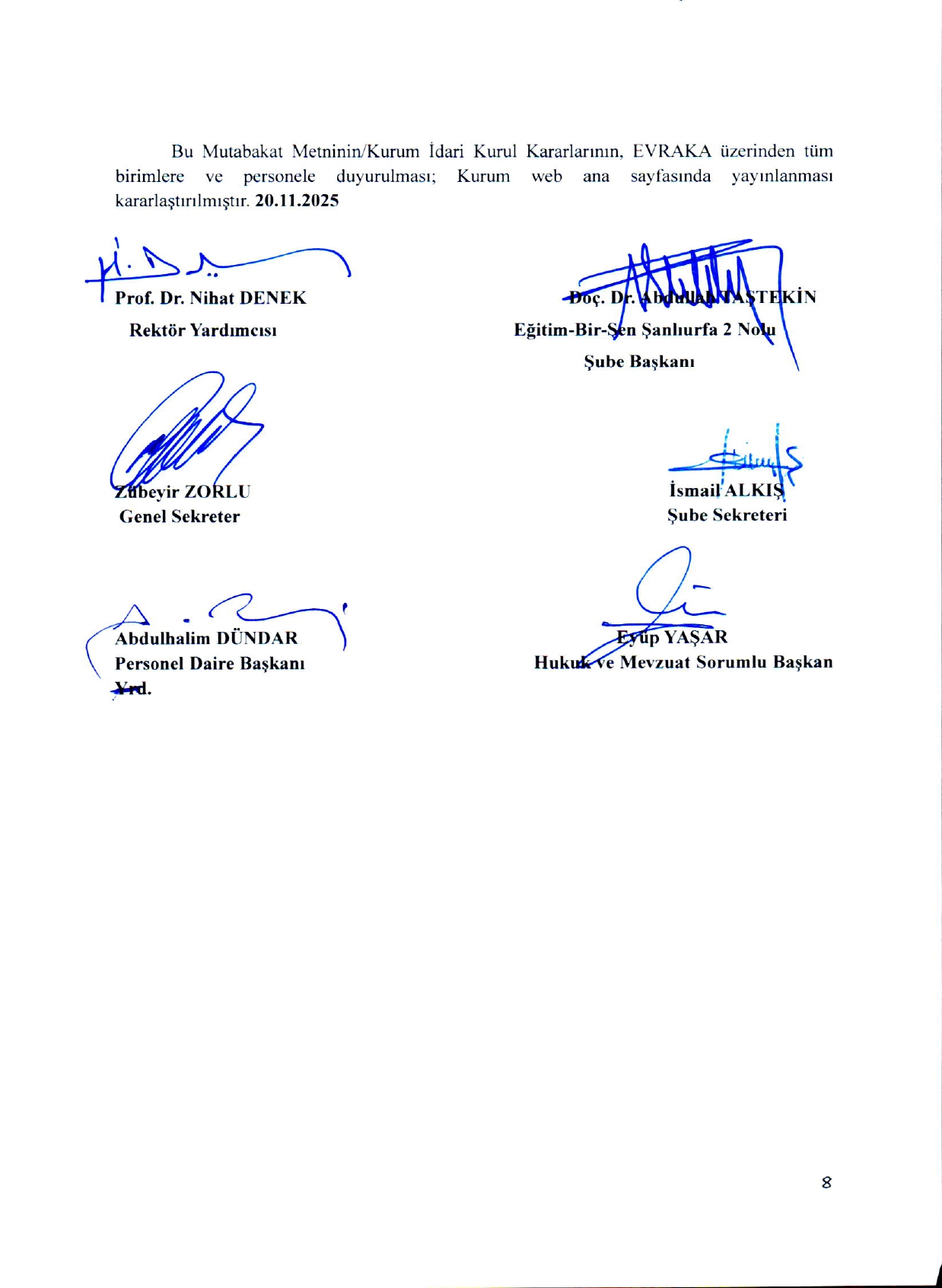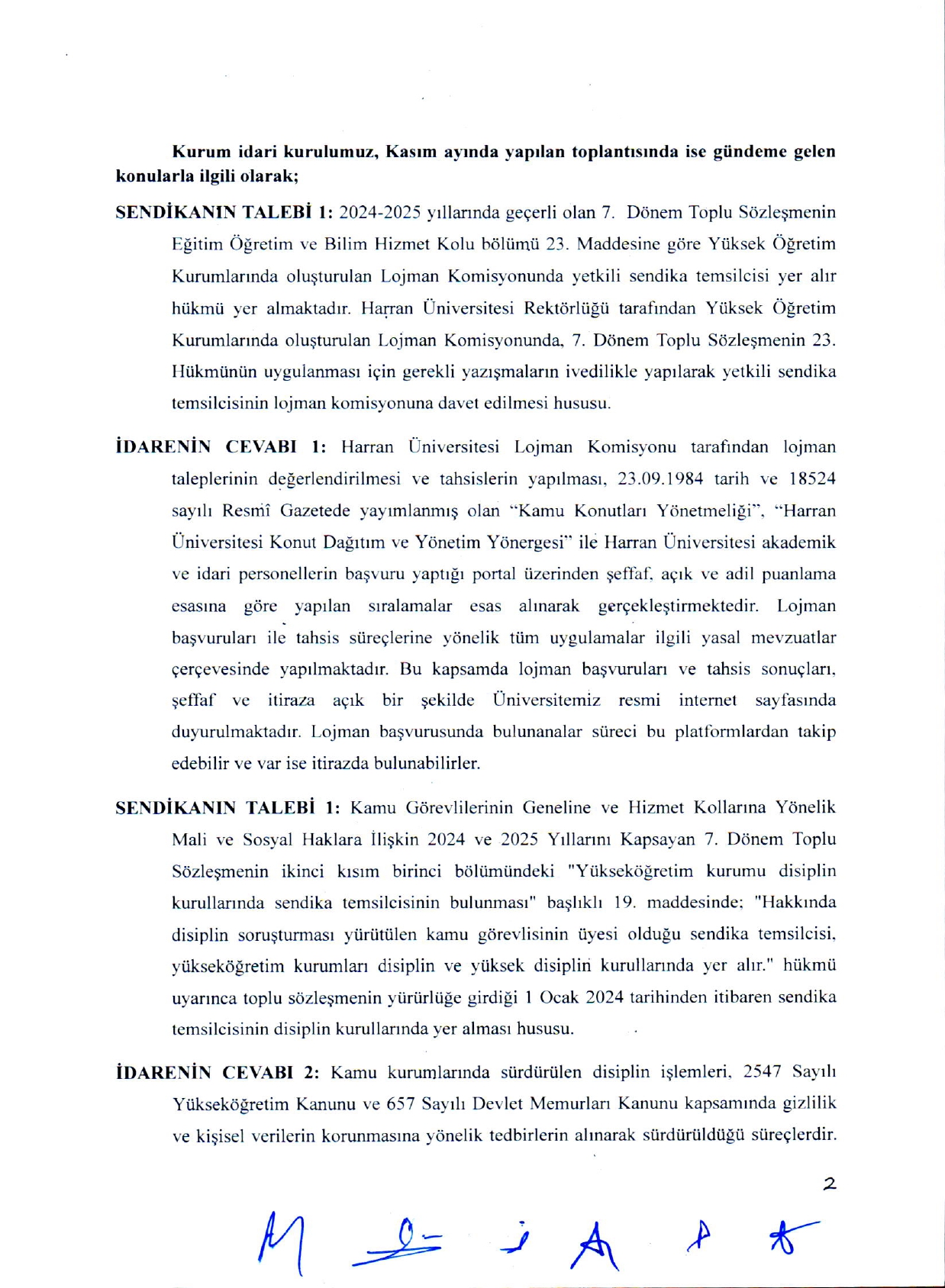 Toplu Sözleşme Görüşmelerinin Yapılma Usul ve Esasları ile Kamu Görevlileri Hakem Kurulu, Kamu Personeli Danışma Kurulu ve Kurum İdari Kurullarının Teşkili, Çalışma Usul ve Esaslarına İlişkin Yönetmelik gereği Üniversitemiz Kurum İdari Kurulu toplantısı Eğitimciler Birliği Sendikası Şanlıurfa 2 Nolu Şube Başkanlığı ile Rektörlüğümüz arasında 20.11.2025 tarihinde yapılarak Kasım 2025 Çalışma Raporu aşağıdaki şekilde sonuçlandırılmıştır.
