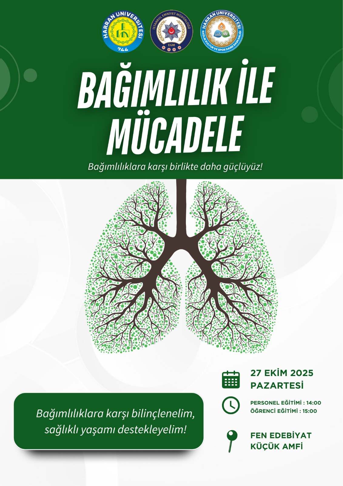Üniversitemiz öğrencileri ve personeline yönelik olarak; Şanlıurfa İl Emniyet Müdürlüğü Narkotik Suçlarla Mücadele Şube Müdürlüğü tarafından, bağımlılıkla mücadelede koruyucu ve önleyici farkındalık oluşturmak amacıyla bilgilendirme ve eğitim faaliyetleri kapsamında Bağımlılıkla Mücadele Eğitimi 27.10.2025 tarihinde düzenlenecektir