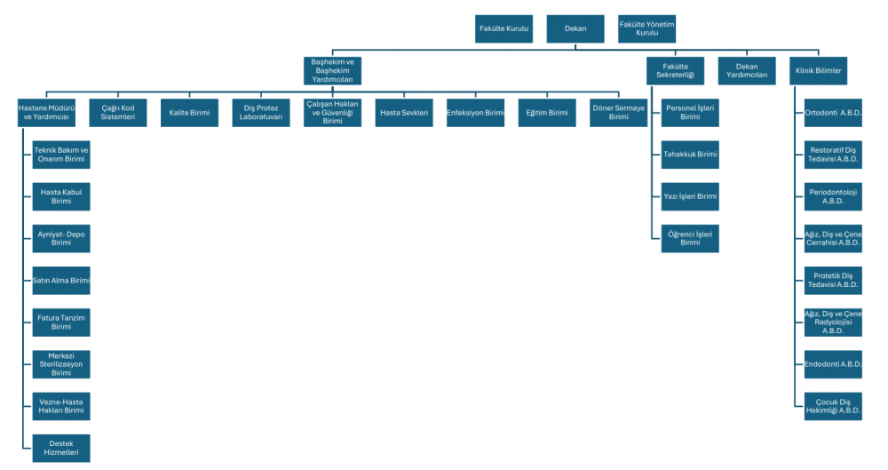 Ağız ve Diş Sağlığı Uygulama ve Araştırma Merkezimiz, Üniversitemizin Diş Hekimliği Fakültesine bağlı olup, organizasyon yapısı birbiriyle ilişkilidir. Fakültenin organizasyon yapısı yönetimde örgütsel kademenin en üst basamağında Dekan, Fakülte Kurulu ve Fakülte Yönetim Kurulu bulunmaktadır. Tüm birimler Dekana, Fakülte Kurulu ve Fakülte Yönetim Kuruluna dikey olarak bağlıdır. Dekan, Fakülte Kurulu ve Fakülte Yönetim Kurulu arasında yatay koordinasyon vardır. Dekan Yardımcılarının da kendi aralarında yatay koordinasyonu olmasına rağmen Fakülte Kurulu ve Fakülte Yönetim Kuruluna dikey olarak bağlıdırlar. Fakülte Sekreteri de üst yönetime dikey olarak bağlıdır. Fakültenin idari birimleri Fakülte Sekreterine dikey olarak bağlıyken, birbirleri arasında yatay ilişki bulunmaktadır.