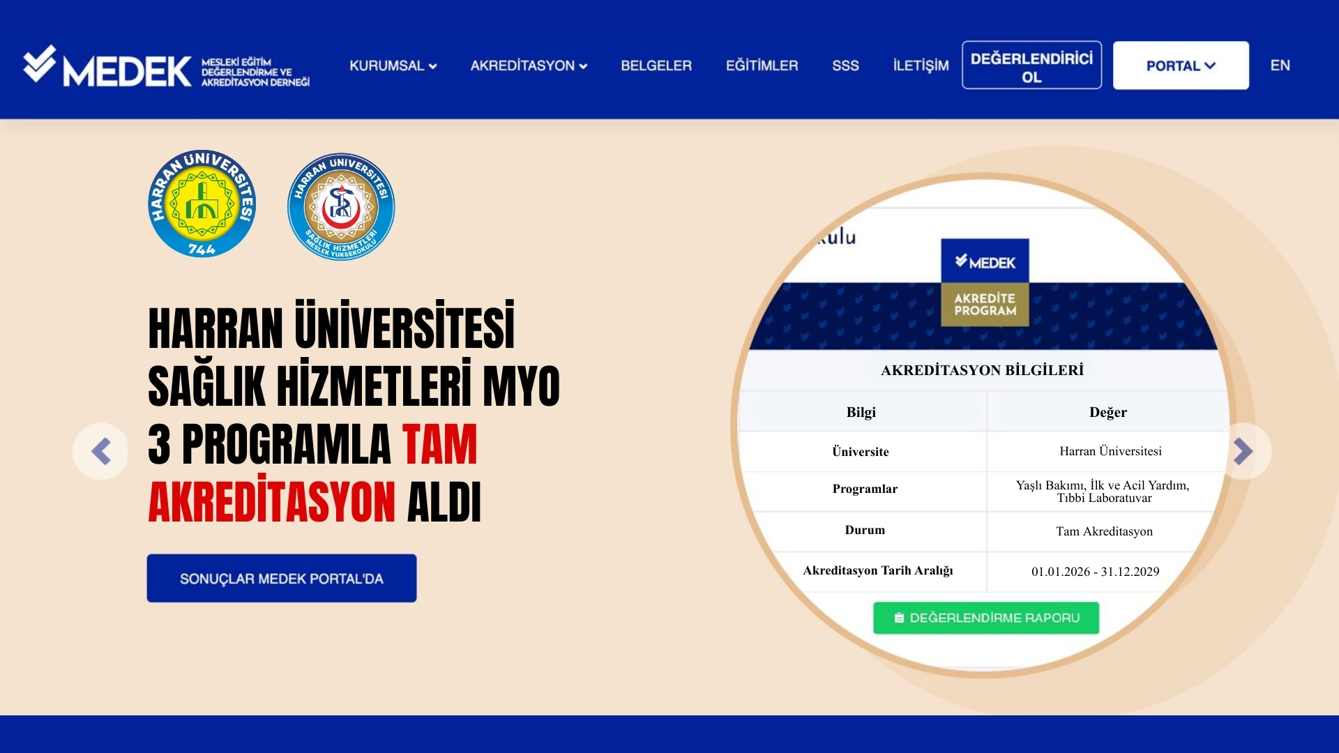 Harran Üniversitesi Sağlık Hizmetleri Meslek Yüksekokulu bünyesinde yer alan İlk ve Acil Yardım, Yaşlı Bakımı ve Tıbbi Laboratuvar Teknikleri programları, Mesleki Eğitim Değerlendirme ve Akreditasyon Derneği (MEDEK) tarafından yürütülen değerlendirme süreci sonucunda tam akreditasyon almaya hak kazandı.