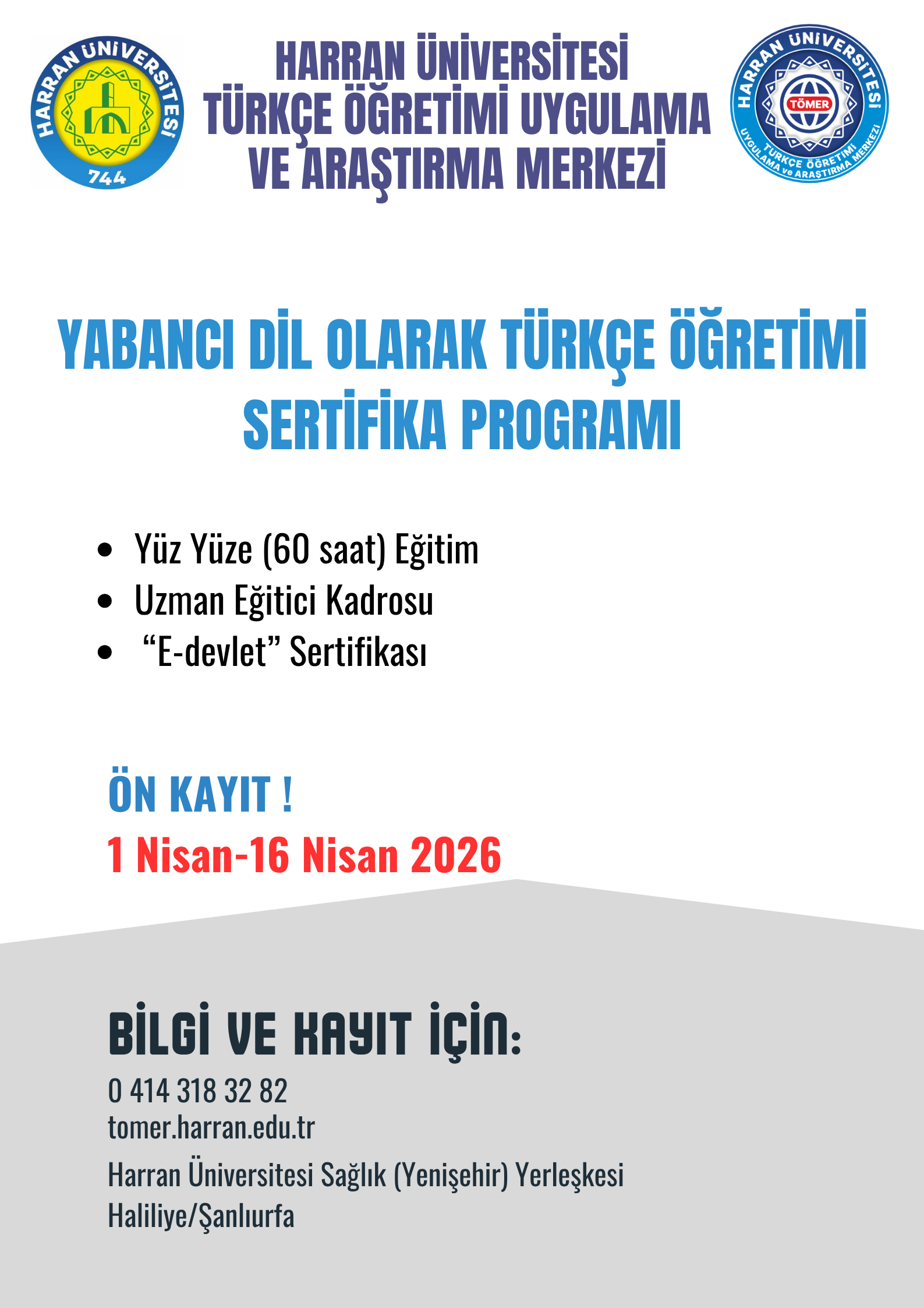 Kesin Kayıt Tarihleri: Adaylar, 20-27 Nisan 2026 tarihlerinde Harran Üniversitesi Sağlık (Yenişehir) Yerleşkesi TÖMER’e şahsen gelmek suretiyle kesin kayıtlarını yapacaklardır. Kesin kayıtta adaylar; 2 adet fotoğraf, kimlik fotokopisi, onaylı mezuniyet belgesi veya öğrenci belgesi fotokopisi, eğitim ücretinin yatırıldığına dair banka dekontu ve Harran Üniversitesi TÖMER’de dolduracakları “Kesin Kayıt Formu” nu teslim edeceklerdir.