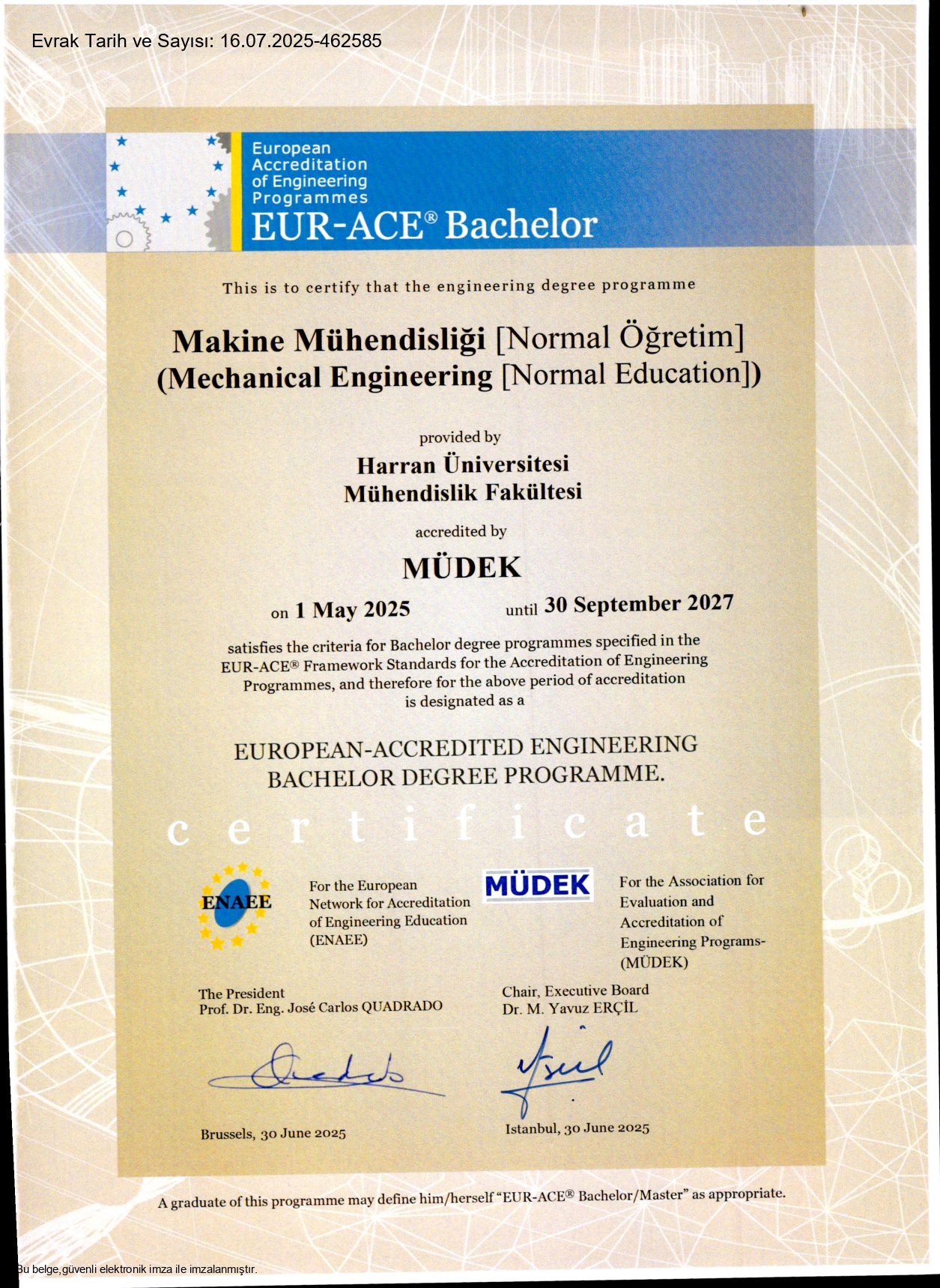 Harran Üniversitesi Mühendislik Fakültesi Makine Mühendisliği Bölümü, uluslararası düzeyde önemli bir başarıya imza attı. Bölüm, Mühendislik Eğitim Programları Değerlendirme ve Akreditasyon Derneği (MÜDEK) tarafından akredite edilerek MÜDEK Akreditasyon Sertifikası ile birlikte Avrupa Mühendislik Eğitimi Akreditasyon Ağı (ENAEE) tarafından verilen EUR-ACE Etiketi almaya hak kazandı.