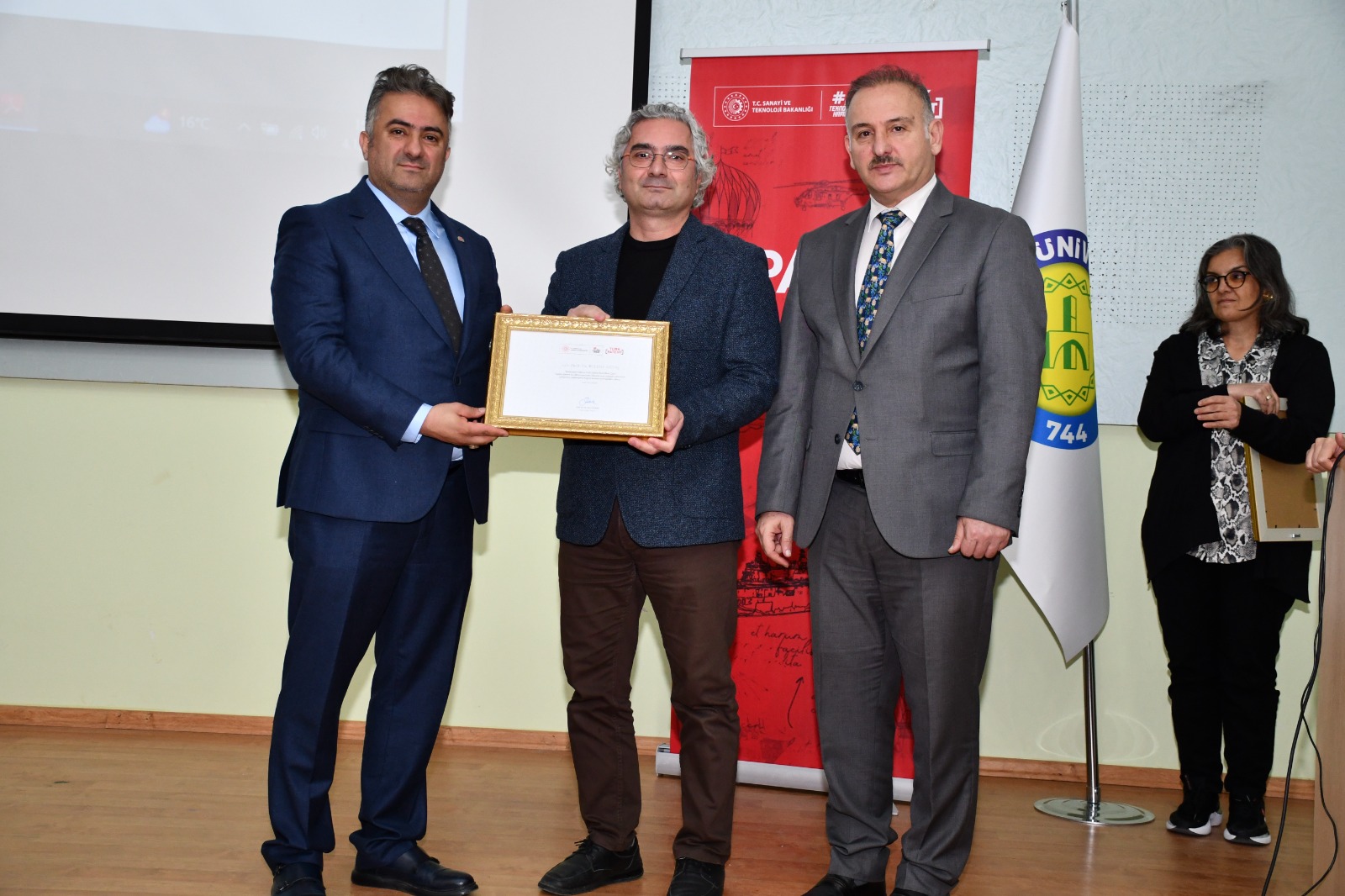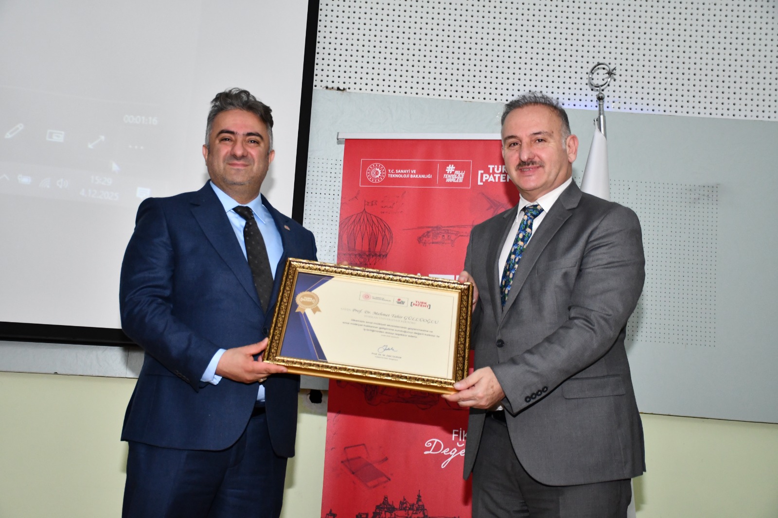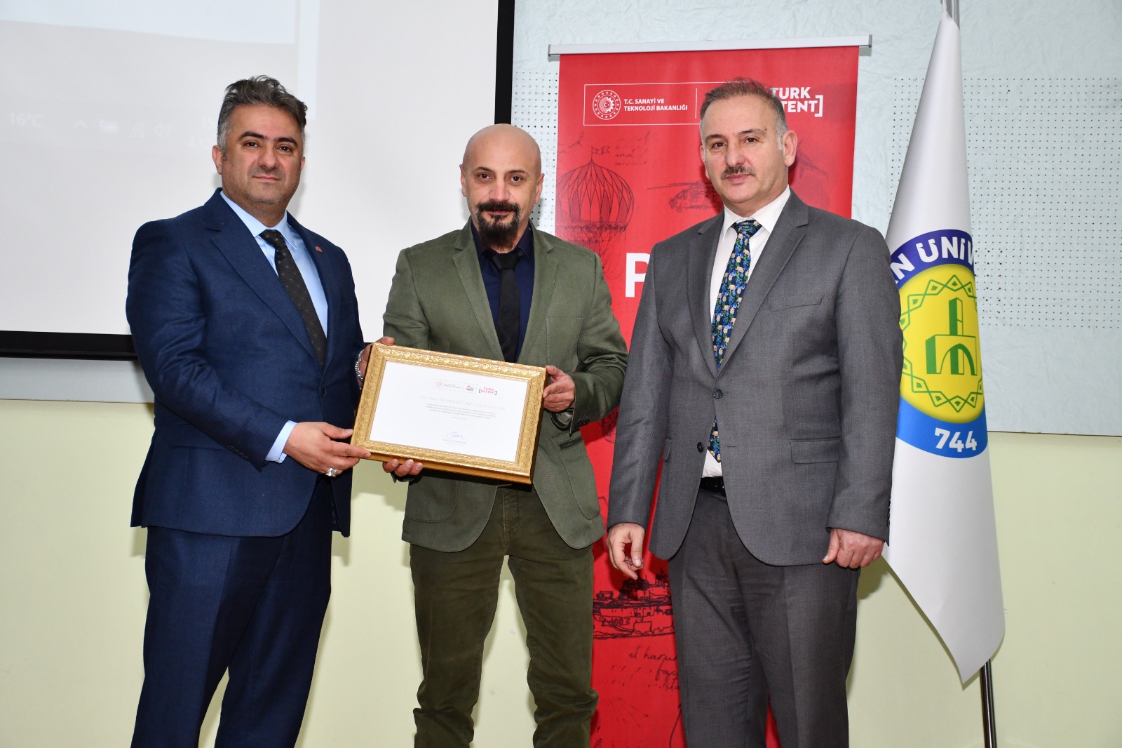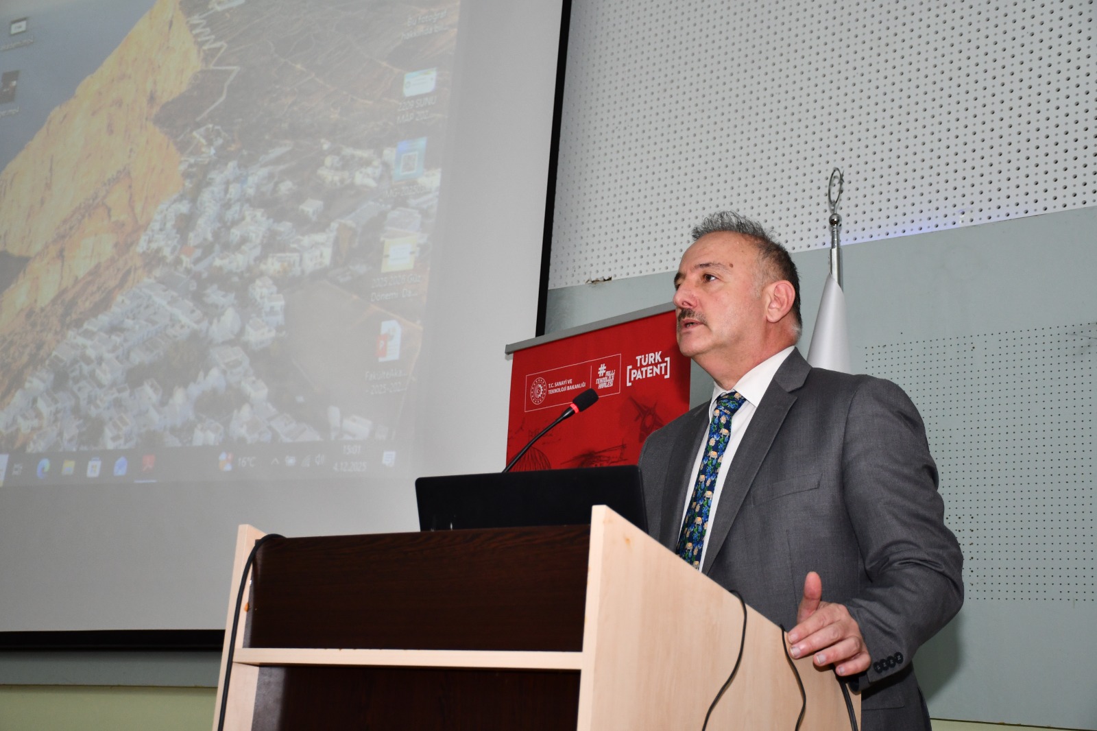 Açılış konuşmasının ardından Prof. Dr. M. Zeki Durak, sınai mülkiyetin akademik üretimdeki rolü, patent, marka, tasarım ve coğrafi işaretlerin bölgesel kalkınmaya katkısı üzerine kapsamlı bir sunum gerçekleştirdi. Durak, üniversitelerin yenilikçilik süreçlerindeki stratejik önemine değinerek patent başvuruları, koruma kapsamı, yazılım telif hakları ve lisans uyum süreçlerine ilişkin güncel uygulamaları paylaştı.