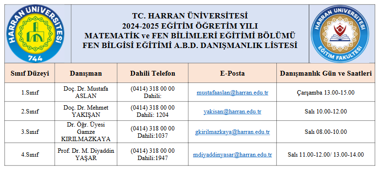 2024-2025 Eğitim Öğretim Yılı Fen Bilgisi Eğitimi A.B.D. Danışmanlık Listesi