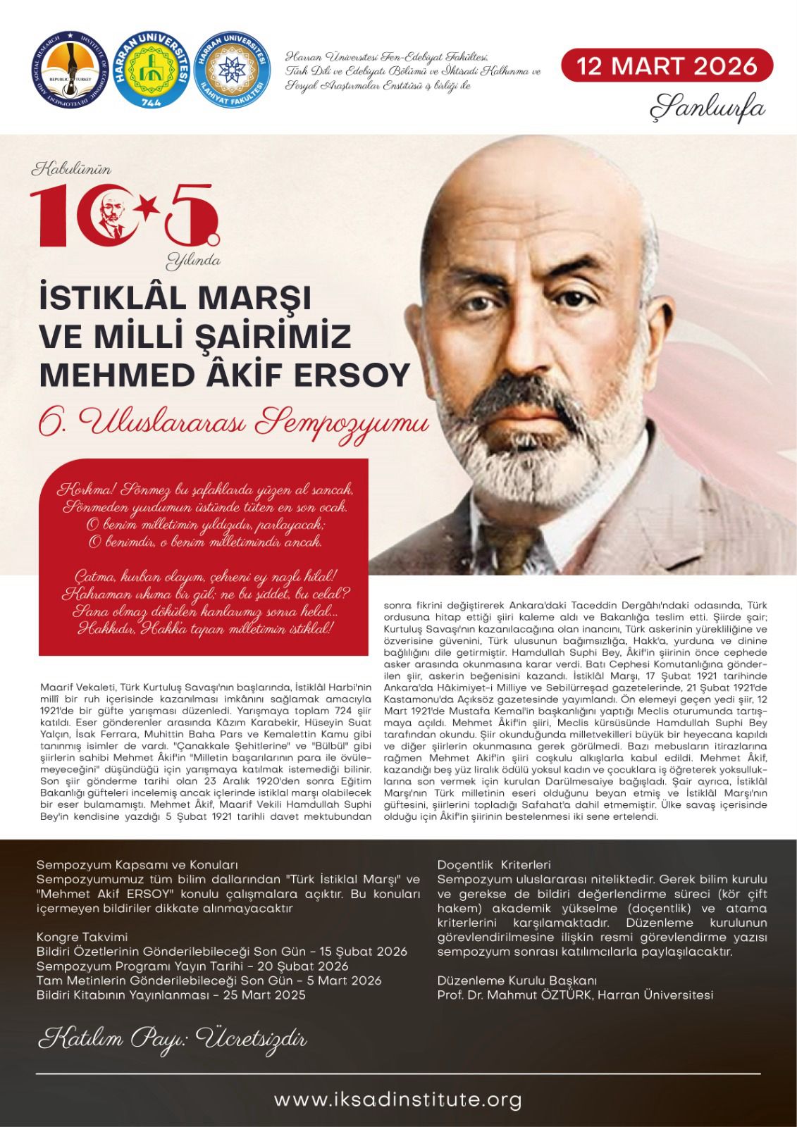 Fakültemiz Türk Dili ve Edebiyat Bölümü ile İktisadi Kalkınma ve Sosyal Araştırmalar Enstitüsü iş birliğiyle düzenlenen “İstiklâl Marşı ve Milli Şairimiz Mehmed Âkif Ersoy 6. Uluslararası Sempozyumu”, 12 Mart 2026 tarihinde Şanlıurfa’da gerçekleştirilecektir.