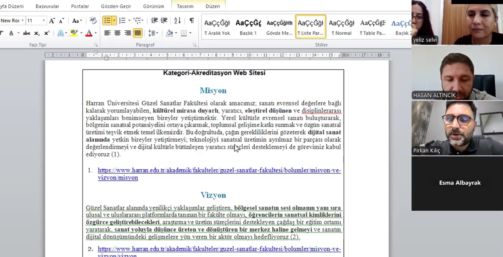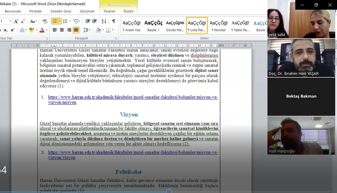Birimimizin misyon, vizyon ve politikalarının güncellenmesine yönelik olarak, Dekan Prof. Dr. Yeliz SELVİ başkanlığında Radyo Tv ve Sinema, Mimarlık ve Resim bölüm başkanları ve kalite elçisi Ar.Gör.Dr. Halil HATİPOĞLU ile iç ve dış paydaşların katılımıyla bir toplantı gerçekleştirilmiştir. Toplantıya; Doç. Dr. Hasan ALTİNCİK (Dicle Üniversitesi İletişim Fakültesi), Dr. Mehmet ULUÇ (Harran Üniversitesi ŞSBMYO RTV Bölüm Başkanı),Esma ALBAYRAK (Urfa Pusula), Hüseyin ÖZKAN (Urfa Pusula / Harran Üniversitesi Medya ve İletişim Çalışmaları YL Öğrencisi),Bektaş BAKMAN (Harran Üniversitesi Medya ve İletişim Çalışmaları YL Öğrencisi), Hayriye DEMİRKOL (Kazancı Bedih Güzel Sanatlar Lisesi),Pirkan KILIÇ (Mimarlar Odası Başkanı) katılmıştır. Toplantının gündeminde;birimin mevcut misyon, vizyon ve politikalarının değerlendirilmesi, güncelleme ihtiyacının tartışılması, iç ve dış paydaşların önerilerinin alınması, yeni stratejik hedeflerin belirlenmesi yer almıştır. Mevcut misyonun günümüz koşullarına uygunluğu, vizyonun kurumsal hedeflerle uyumu, politikaların paydaş beklentilerini karşılayıp karşılamadığı, güçlü ve gelişmeye açık yönleri tartışılmıştır. Sonuç olarak; toplantıda, misyon ve vizyon ifadelerinin çağın gereklilikleri ve paydaş beklentileri doğrultusunda revize edilmesine, politika alanlarının ise daha kapsayıcı ve uygulanabilir bir çerçevede yeniden düzenlenmesine karar verilmiştir.