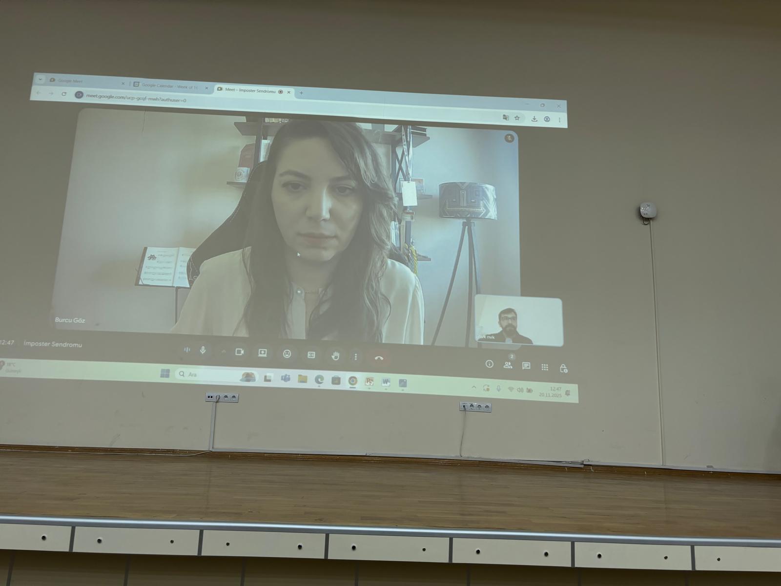 Programın ilk bölümünde, Dokuz Eylül Üniversitesi öğretim görevlisi Dr. Burcu Göz Tebrizcik, imposter sendromu üzerine kapsamlı bir sunum yaptı. Katılımcılara bu durumun ortaya çıkış biçimleri, öğrenciler üzerindeki etkileri ve başa çıkma yaklaşımları hakkında ayrıntılı bilgiler aktarıldı. Öğrenciler, sık karşılaşılan bu durumla ilgili sorularını yönelterek konuya dair merak ettikleri noktaları netleştirme fırsatı buldu.