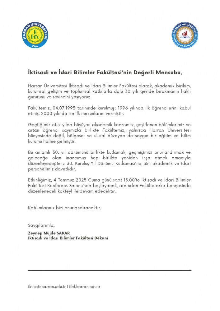 Fakültemiz eğitim-öğretim faaliyetlerinin yanı sıra gerçekleştirdiği etkinliklerle akademik ve sosyal yaşamı zenginleştirmeye devam etmektedir. Fakültenin 30. kuruluş yılı vesilesiyle düzenlenen özel program, hem akademik camia hem de bölge halkı nezdinde büyük yankı uyandırmıştır. Fakülte Konferans Salonu’nda düzenlenen etkinlikte, üniversite rektörlüğü ve fakülte yönetiminin yanı sıra çok sayıda davetli hazır bulunmuş; İİBF'nin kurumsal geçmişi ve gelecek vizyonu katılımcılarla paylaşılmıştır.