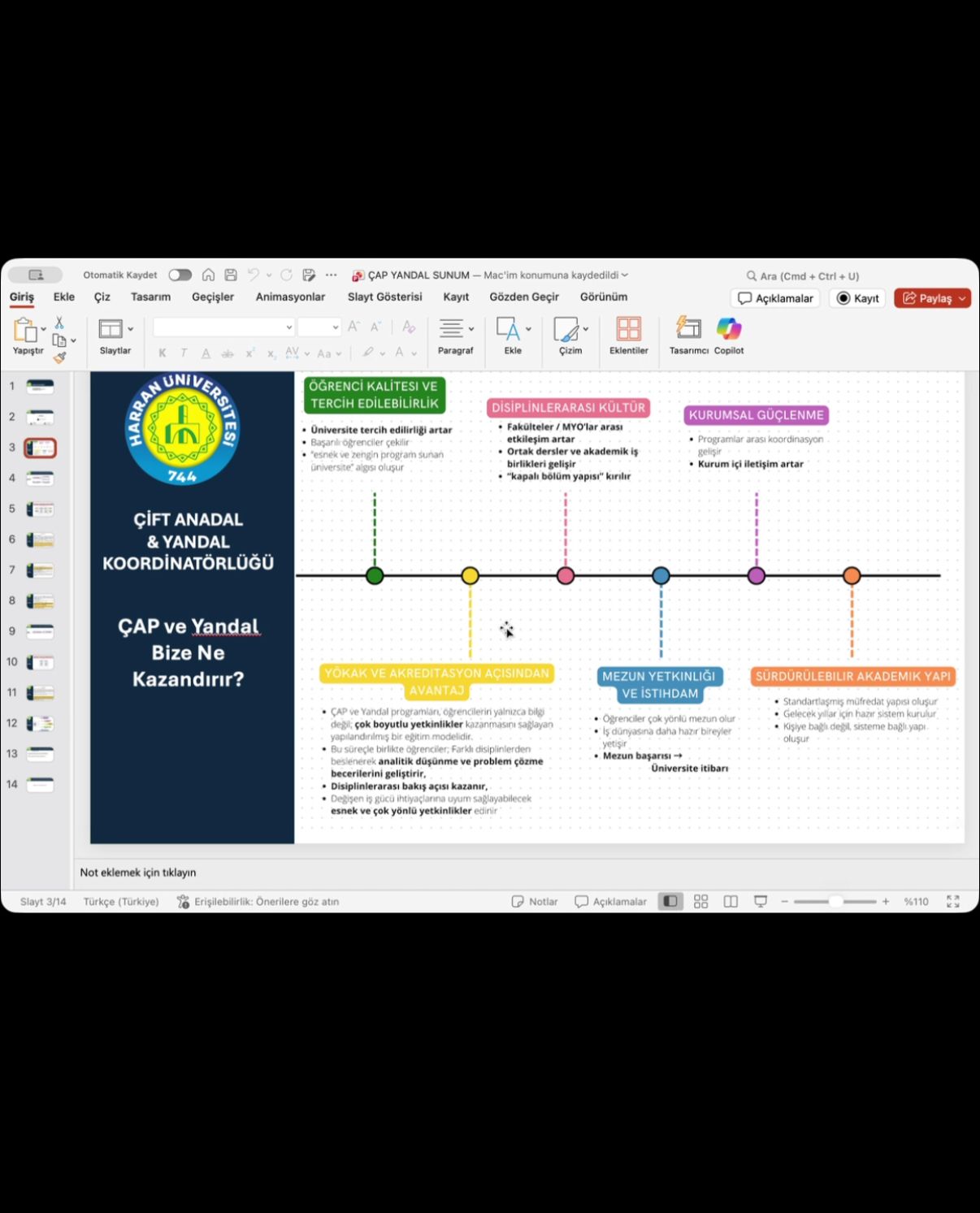 Öğr. Gör. Sinem BARUT KIRAT'ın koordinasyonunda gerçekleştirilen toplantıda; ÇAP ve Yandal programlarına ilişkin genel çerçeve paylaşılarak müfredat oluşturma sürecinde kullanılacak şablon ve esaslar tanıtıldı. Ayrıca birim bazlı görev ve sorumluluklar değerlendirilirken, sürecin YÖKAK ve ilgili akreditasyon kuruluşlarının kalite güvencesi ölçütleri doğrultusunda yürütülmesine ilişkin beklentiler aktarıldı.