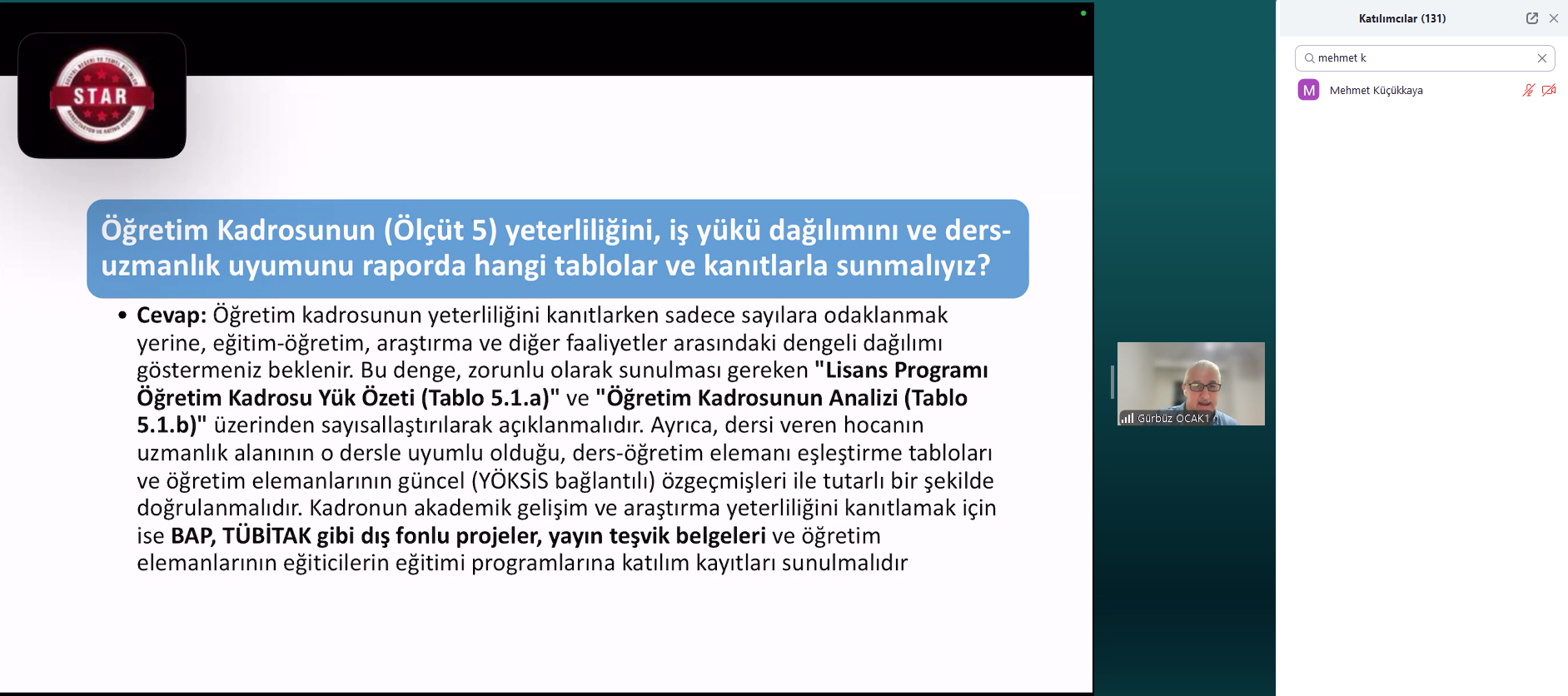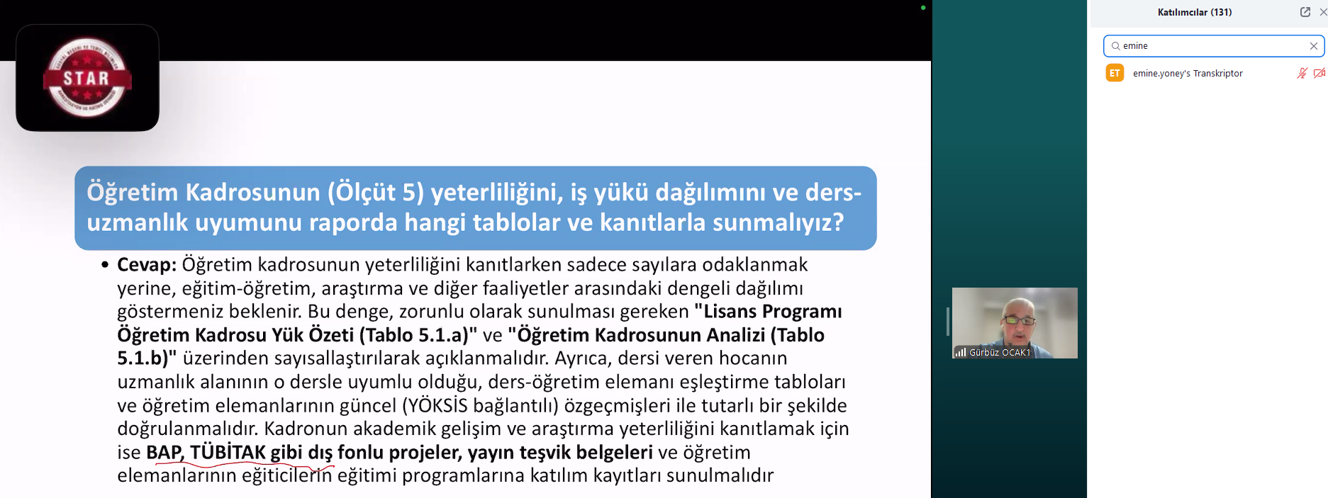 STAR Öz Değerlendirme Raporu (ÖDR) hazırlama eğitimi kapsamında 23 Mart 2026 tarihli oturumlarda, Prof. Dr. Ali BAYRAKDAROĞLU tarafından STARNET sistemi üzerinden ÖDR metinlerinin ve kanıtların sisteme eklenmesine ilişkin bilgilendirme yapılmıştır. Prof. Dr. Gürbüz OCAK tarafından yapılan sunumlarda ise Değerlendirme ve Akreditasyon Süreçleri başlığı altında STAR akreditasyon döngüsünün temel aşamaları (niyet beyanı, başvuru, ÖDR teslimi, ön değerlendirme, saha ziyareti ve karar) kritik tarihler ve sorumluluklar çerçevesinde ele alınmış; süreç bütünlüğü, hazırlık süreci ve saha ziyareti organizasyonuna ilişkin uygulama esasları değerlendirilmiştir.