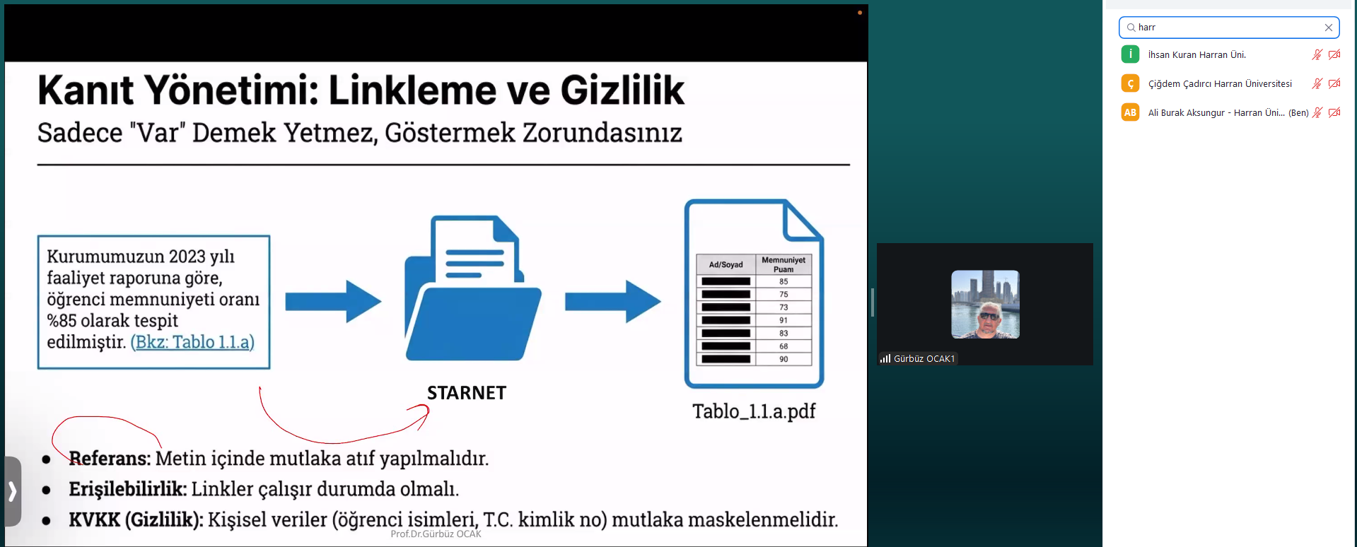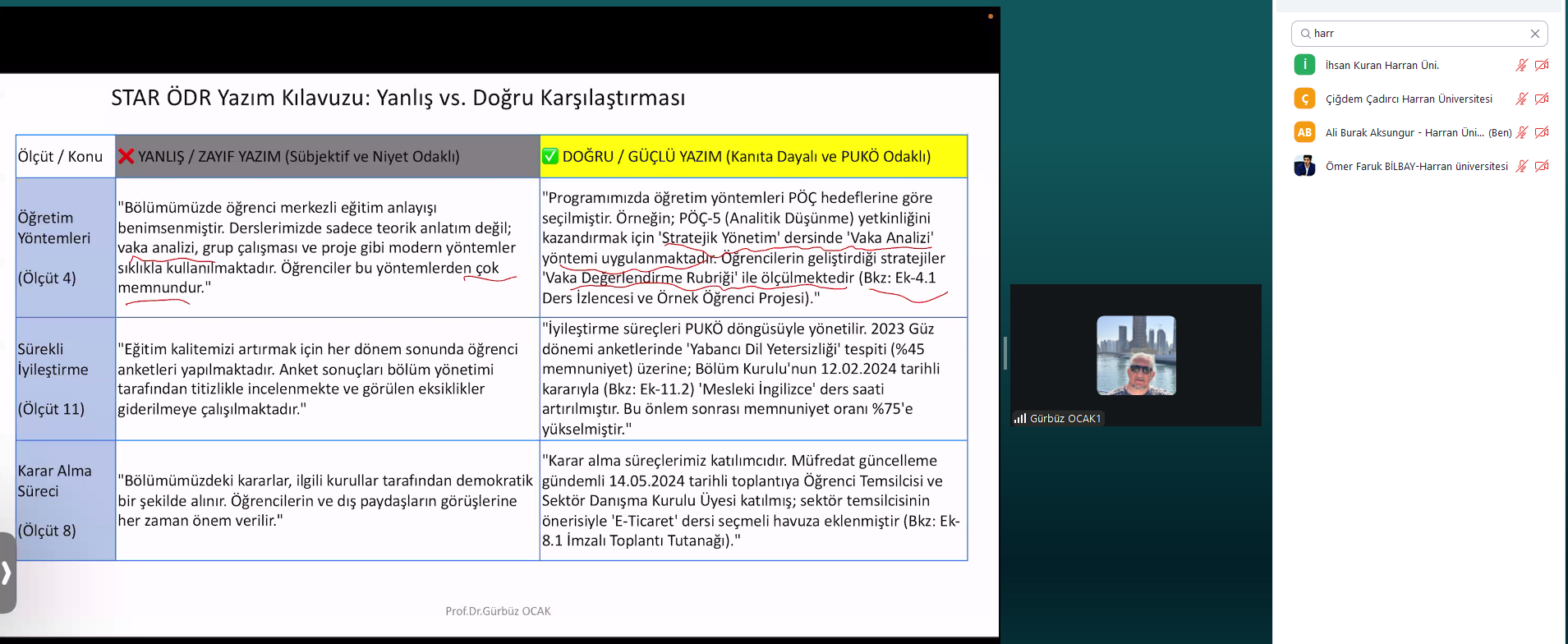 STAR Öz Değerlendirme Raporu (ÖDR) hazırlama eğitimi kapsamında 14 Mart 2026 tarihli oturumlarda; 5.2 İyileştirmeye Açık Yanların Yazımı başlığı altında eksikliklerin “gelişime açık yön” olarak profesyonel ve şeffaf bir dille formüle edilmesi ile gelecek planlarının (Planla) rapora dâhil edilmesine ilişkin yazım yaklaşımı ele alınmıştır. Devamında 5.3 Değerlendirme Rubriğini Anlamak oturumunda STAR puanlama mantığı çerçevesinde Tam Uyum (TU), Oldukça Uyumlu (OU), Kısmen Uyumlu (KU) ve Uyumlu Değil (UD) düzeylerinin anlamı ve raporlamaya etkisi değerlendirilmiştir.