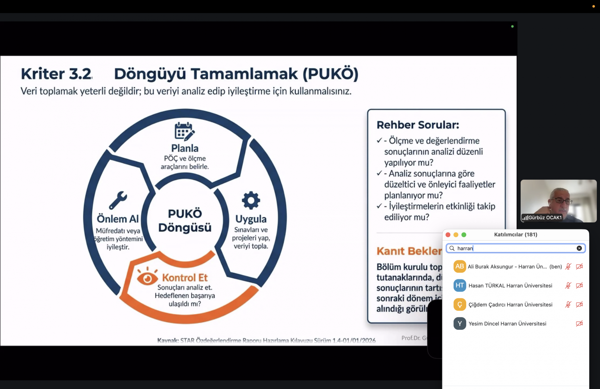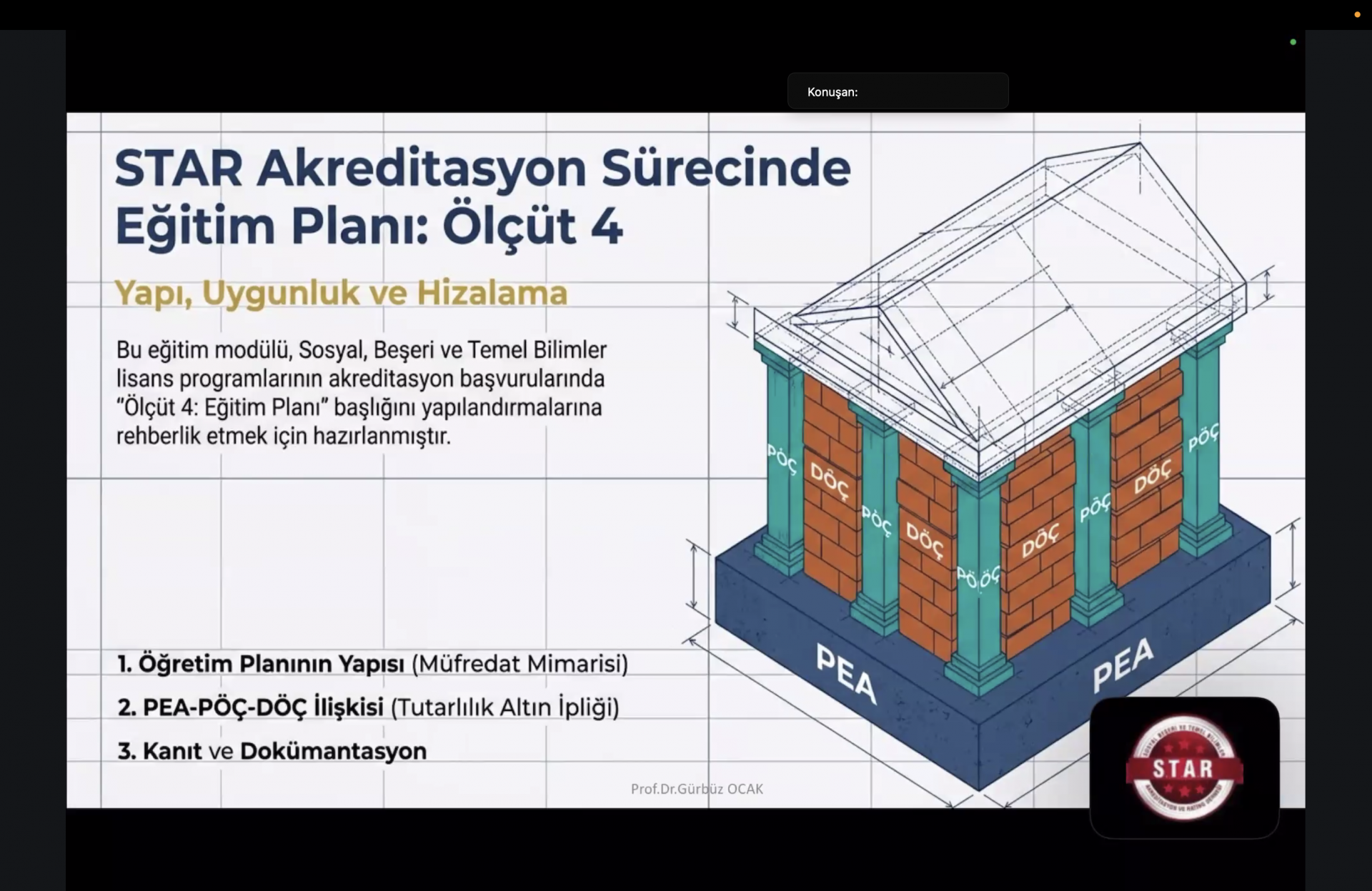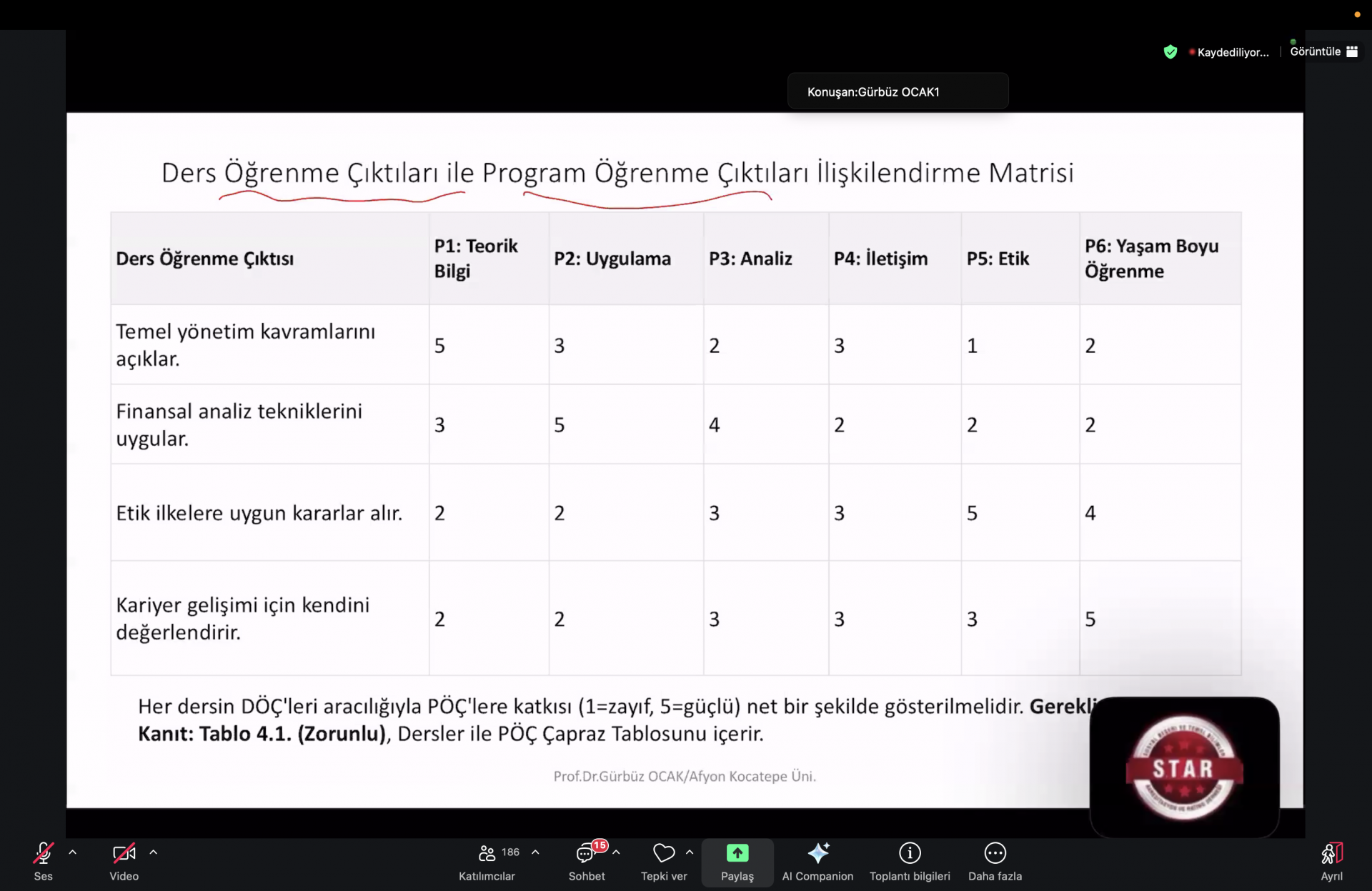 STAR Öz Değerlendirme Raporu (ÖDR) hazırlama eğitimi kapsamında gerçekleştirilen oturumlarda; Ölçüt 3 başlığı altında Program Öğrenme Çıktılarının (PÖÇ) ölçme-değerlendirme sistemiyle ilişkilendirilmesi, PÖÇ’lere ulaşma düzeyinin izlenmesi ve raporlama sürecinde kullanılacak temel uygulama esasları ele alınmıştır. Ölçüt 4 oturumunda ise eğitim-öğretim süreçlerinin planlanması ve yürütülmesi, öğretim planının işleyişi, ders bilgi paketleri ve uygulama başlıkları çerçevesinde değerlendirici beklentileri doğrultusunda raporlama yaklaşımı üzerinde durulmuştur.