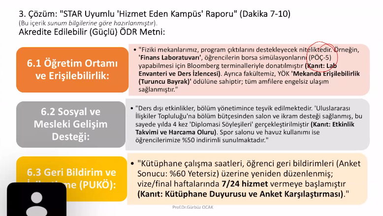 STAR Öz Değerlendirme Raporu (ÖDR) hazırlama eğitimi kapsamında 06 Mart 2026 tarihinde gerçekleştirilen oturumlarda; Ölçüt 6: Yönetim başlığı altında öğretim fiziki ortamının yeterliliği ve erişilebilirliği, geri bildirim mekanizmaları, ders dışı sosyal-sportif-kültürel altyapı ile mesleki gelişim destekleri, bilgi sistemleri ve kütüphane/laboratuvar/fiziksel mekânların durumu ile bütçe yönetimi ve mali kaynaklar ele alınmıştır. Devamında Ölçüt 7: Kurumsal Destek ve Finansal Kaynaklar oturumunda kurumsal destek-liderlik ve finansal kaynakların yönetimi, altyapı işletme ve bakım-onarım için finansal planlama, idari ve teknik personelin nicelik-nitelik yeterliliği, dış destek hizmetlerinin izlenmesi ve yönetimi ile finansal kaynakların öğretim kadrosunun niteliği ve akademik gelişime katkısının kanıta dayalı biçimde raporlanmasına ilişkin uygulama esasları değerlendirilmiştir.
