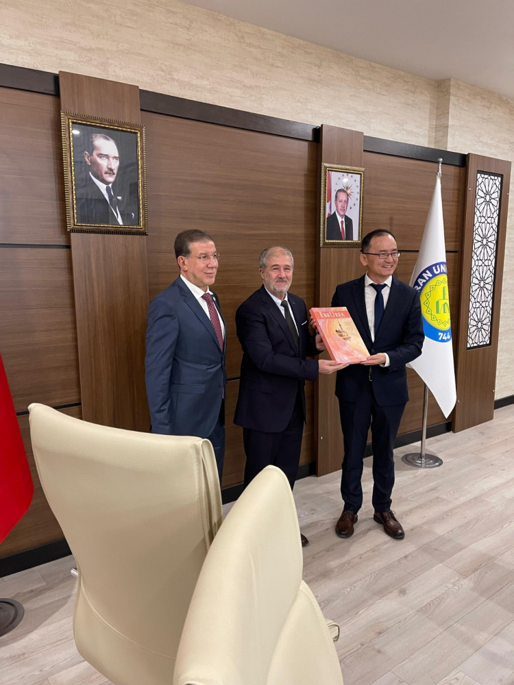 Rektörlükte yapılan toplantıda görüş alışverişinde bulunuldu. İki ülke arasında yapılabilecek protokoller, öğrenci değişimleri, ilmi, kültürel ve sanat faaliyetleri konularında görüş alışverişi yapıldı. Dekanımız Prof. Dr. Ömer Sabuncu Geleneksel Ebru Sanatı hakkında kısa bir sunum gerçekleştirdi. 2018 yılında 15 gün süreyle Çin’de Ebru sanatı seminer ve uygulamaları yaptığını ifade etti. Harran Üniversitesi İlahiyat Fakültesi bünyesinde bir sanat atölyesi bulunduğunu söyledi. Çin Büyükelçisi ve Kültür Müsteşarı konuyla çok ilgilendiler ve bu sanatın eğitim ve uygulamasından çok memnun kalacaklarını; kısa süreli seminerler ve 1 yıl süreli eğitim ve atölye çalışmaları için Çin’e davet etti. Toplantı sonunda Dekanımız EbruUrfa/Ebrularla Urfa adlı sanat eserini Çin Ankara Büyükelçisi Ciang Şüebin’e hediye etti.