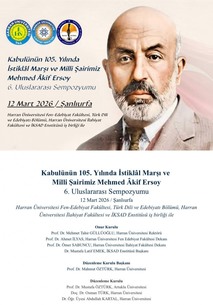 Harran Üniversitesi İlahiyat Fakültesi, Fen-Edebiyat Fakültesi ve İktisadi Kalkınma ve Sosyal Araştırmalar Enstitüsüsü (İKSAD) ortaklığında, İstiklâl Marşı’nın kabul edilişinin 105. yılı münasebetiyle düzenlenecek olan “Kabulünün 105. Yılında İstiklâl Marşı ve Milli Şairimiz Mehmed Âkif Ersoy 6. Uluslararası Sempozyumu”için hazırlıklar tamamlandı. 12 Mart 2026 tarihinde gerçekleştirilecek olan etkinlik, Şanlıurfa’nın köklü eğitim kurumu Harran Üniversitesi’nin ev sahipliğinde kapılarını açacak.