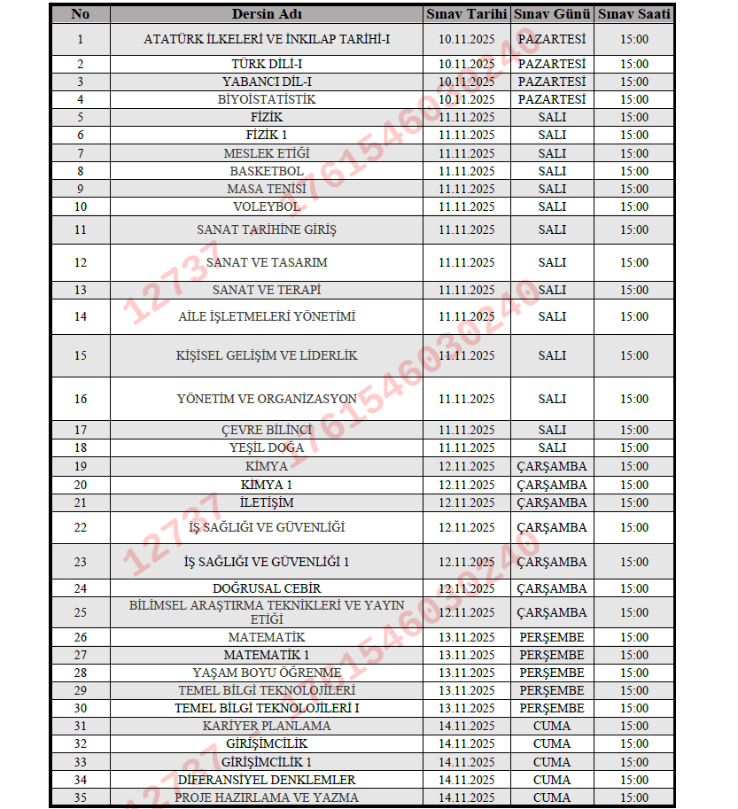 Üniversite Ortak Seçmeli ve Zorunlu Derslerin Ara Sınav Tarihleri ve Saatleri