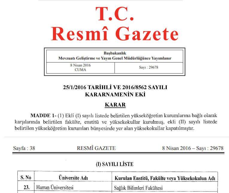 Harran Üniversitesi Sağlık Bilimleri Fakültesi, 8 Nisan 2016 tarihli ve 29678 sayılı Resmî Gazete’de yayımlanarak resmiyet kazanmıştır. Fakültenin kuruluşu, Yükseköğretim Kurulu’nun (YÖK) önerisi doğrultusunda, sağlık alanındaki kurumsal yapılanmayı güçlendirmek amacıyla gerçekleştirilmiştir.